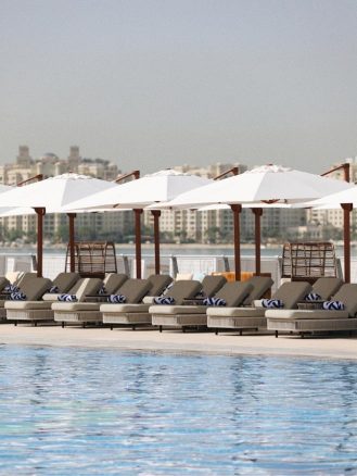 The newest arrival to The Palm, the Taj Exotica sits between the Arabian Sea and the city skyline and welcomes guests to one of Dubai’s first entirely sustainable hotels. The grand resort blends serenity with elegant contemporary interiors. Its dreamy oceanfront pool is the place to be for ultimate relaxation.