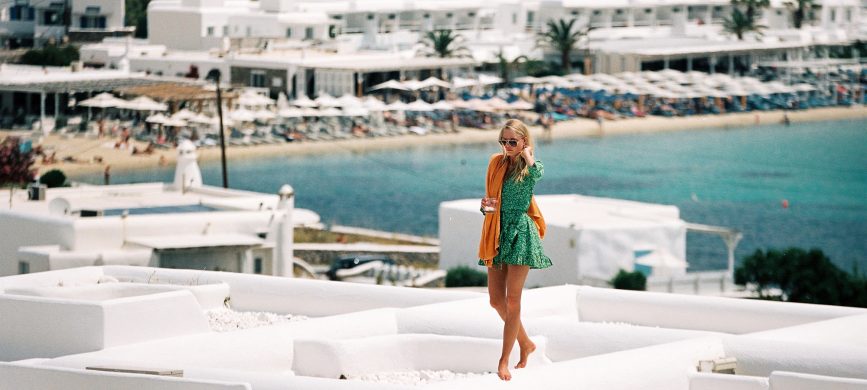 Boasting an ideal location in The Bay of Ornos—one of the prettiest spots on the entire island—Kivotos Mykonos was a natural fit when curating a scenic backdrop for a dreamy, Greek island photoshoot for Faithfull the Brand‘s 2018 Resort Collection.