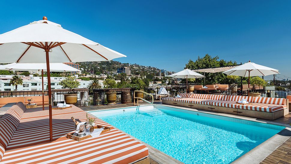 There’s a Moroccan bohemian vibe to Petit Ermitage’s rooftop, which makes it feel refreshingly different from most other Los Angeles hotels. It features a pool, big daybeds, fireplace, lots of greenery—in fact, it’s somewhat of a butterfly refuge—and West Hollywood views.
