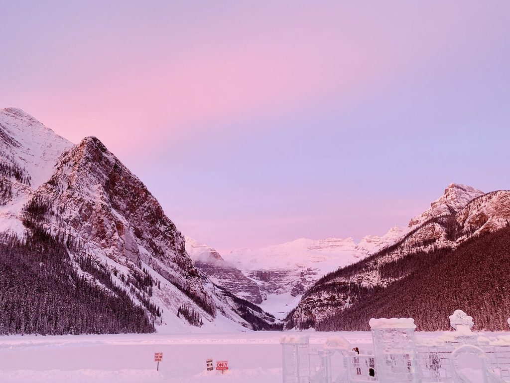A little less than an hour later, we arrive at the Fairmont Chateau Lake Louise and check into a room with a view of the lake for the night. Inquire about sunrise and set the alarm accordingly—there’s nothing quite like waking up to the awe-inspiring alpenglow over Lake Louise at dawn.