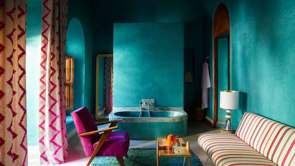 Designed to immerse guests in the vibrancy and artisanal heritage of Marrakech, El Fenn is steeped in saturated colors, hand-crafted details and mid-century design. On its walls are many artworks, both from co-owner Vannessa Branson’s private collection as well as acquired pieces from contemporary artists, including Fred Pollo and Antony Gormley.