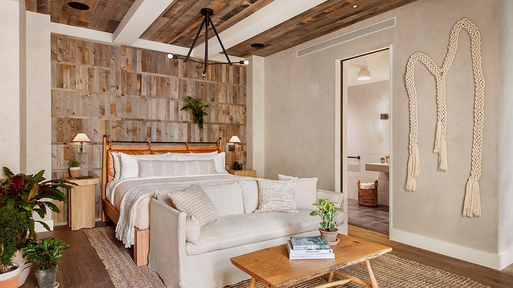 Thoughtful touches bring nature inside with a reclaimed barnwood ceiling and live plants sprinkled throughout.
