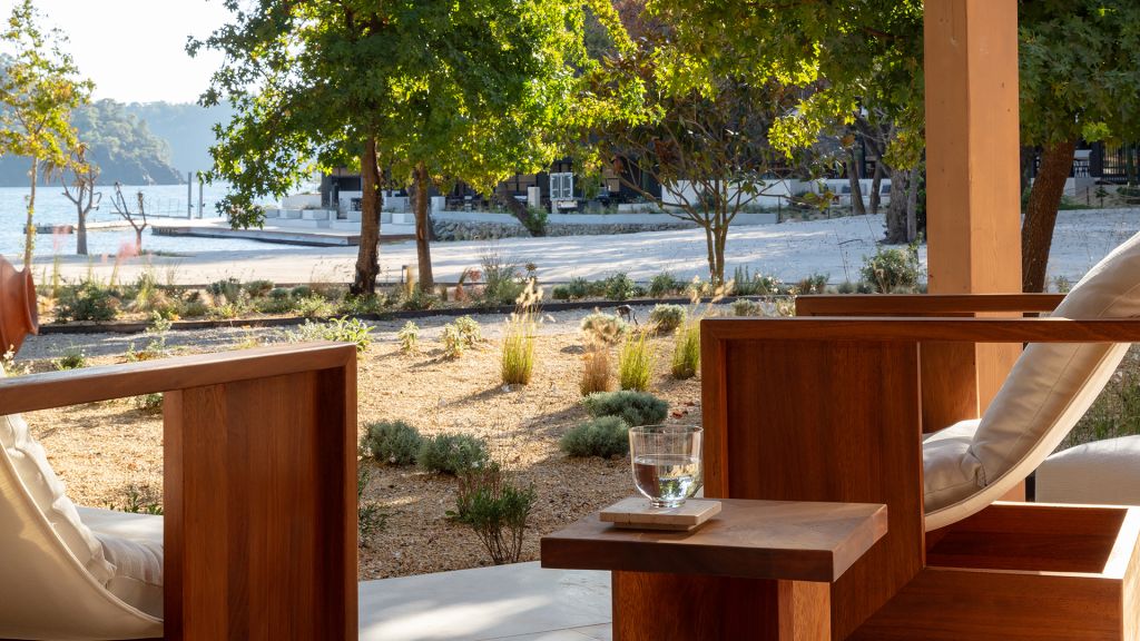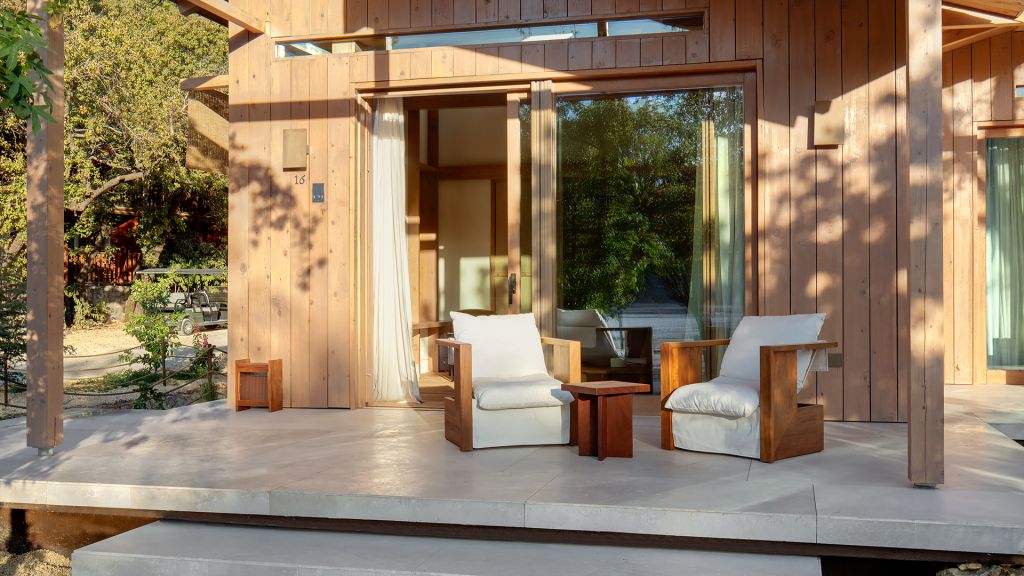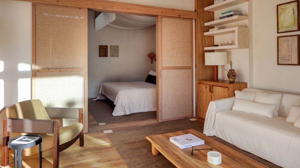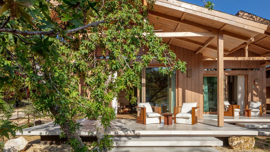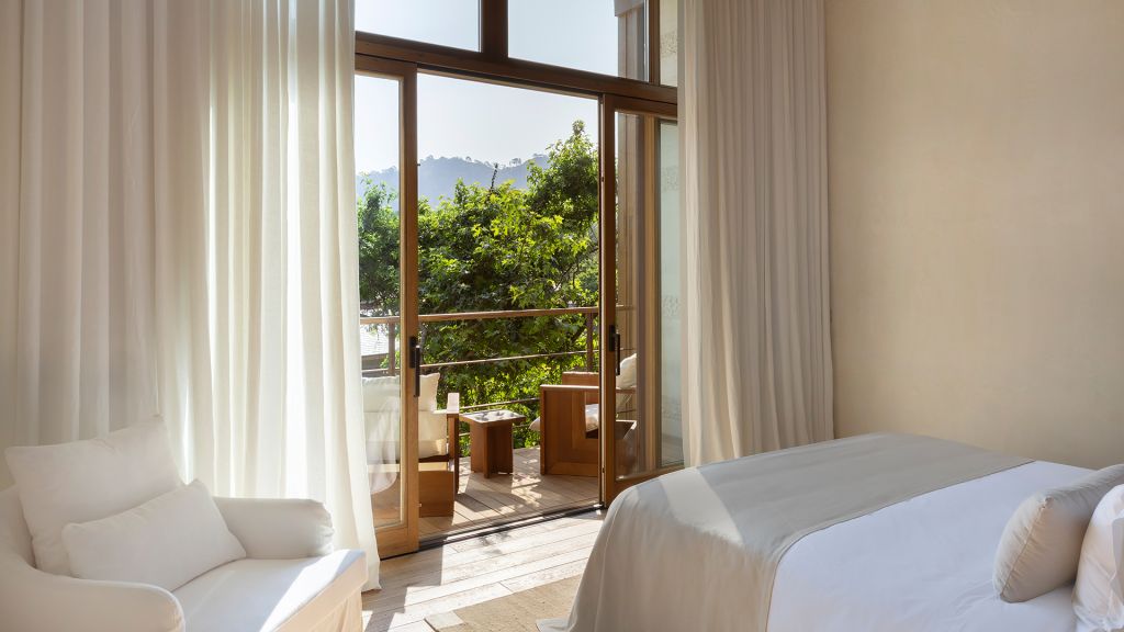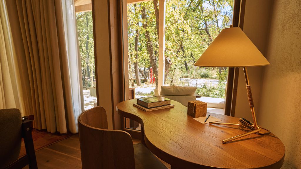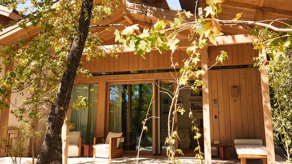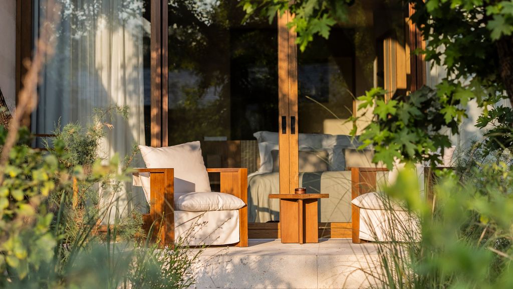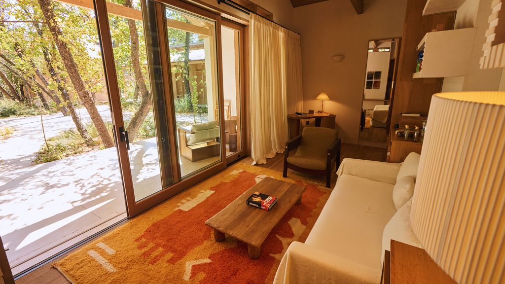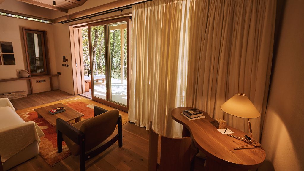 The cabana features a private terrace, two bedrooms with ensuite bathrooms, queen or twin bed, living room, minibar, shower, coffee and tea setup, safe. The interiors are inspired by the light and airy essence of the Mediterranean, overlooking the forest.