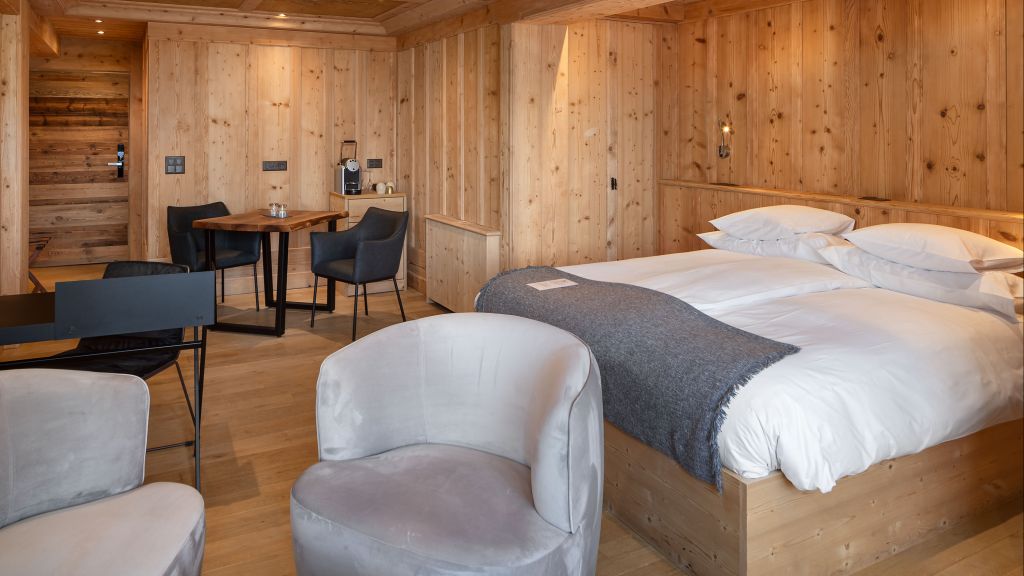 2 bedrooms with 1 king size bed 200x200 each – 85sqm / 914sqft – sitting area – desk – balcony – mountain view – located upstairs, the first spacious bedroom with a terrace overlooks the valais alps on all sides, while the pleasant living room faces south and south-west. The magnificent sunsets will be there. A second bedroom open to the north adds to this serene environment. – 2 en-suite bathrooms - one with shower and one with bathtub – separate toilets – makeup mirror – hairdryer – bathrobes and slippers – complimentary wi-fi – satellite tv – telephone – safe – minibar – tea / coffee machine – no children under 16 years – no extra bed possible – 4 persons maximum