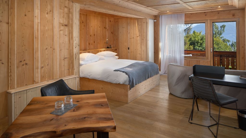 Each of the rooms and suites at Aïda Hôtel & Spa feature large French windows that open onto a south-facing terrace. These private spaces showcase a breathtaking view of the valley and Swiss Alps. Within, rustic-style wood panelling and comfy furnishings make one feel instantly at home, while flatscreen TVs and complimentary Wi-Fi keep guests connected to the world outside.