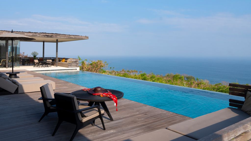Relax in comfort within the 32,300 square feet ocean view villa, blending modern design with Balinese charm atop Bali’s cliffs. Enjoy a serene retreat with stunning Indian Ocean views.