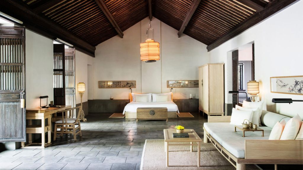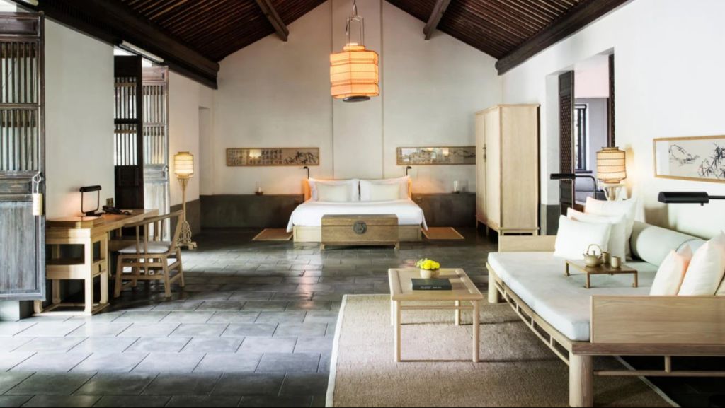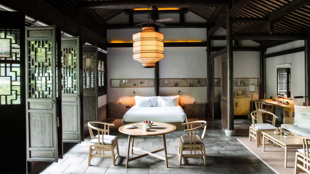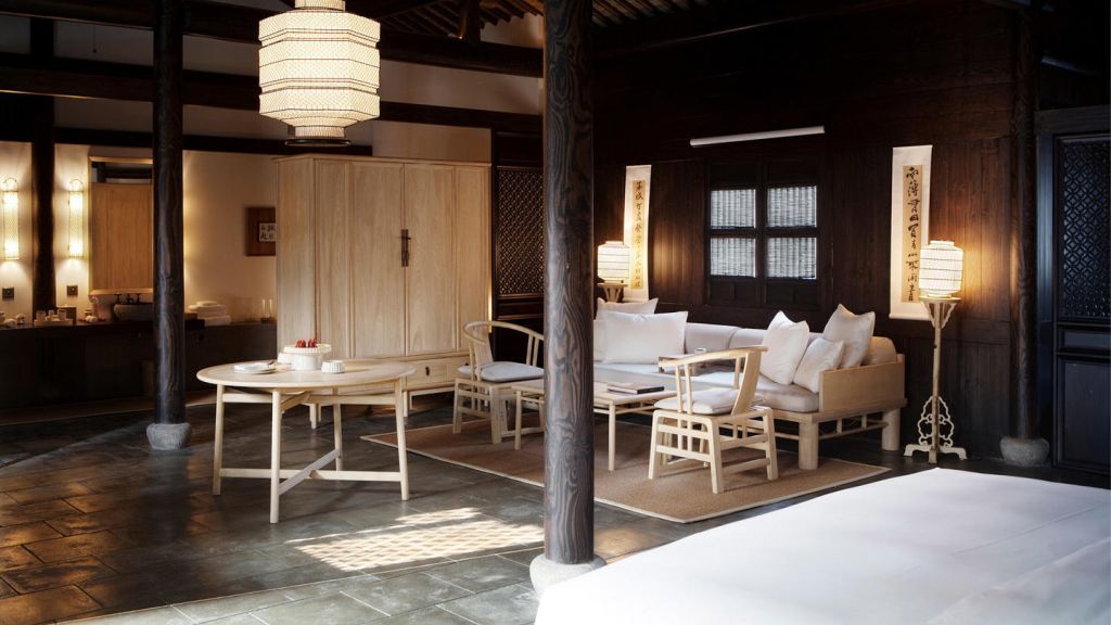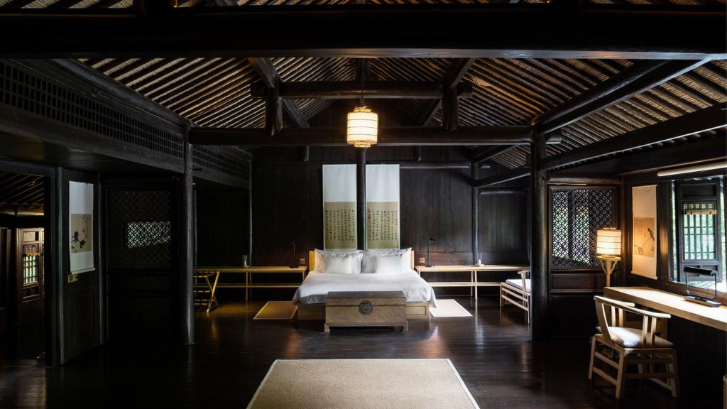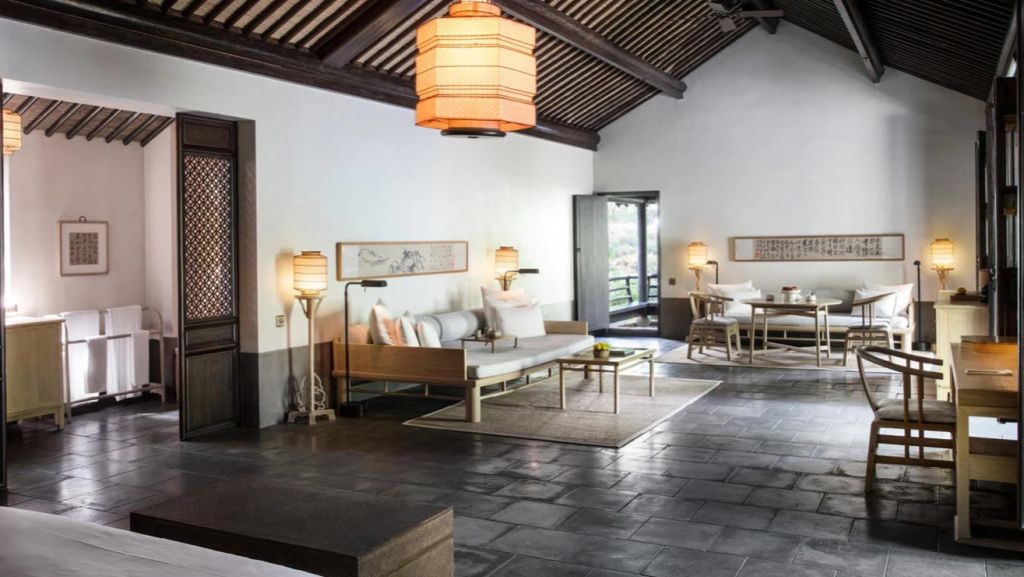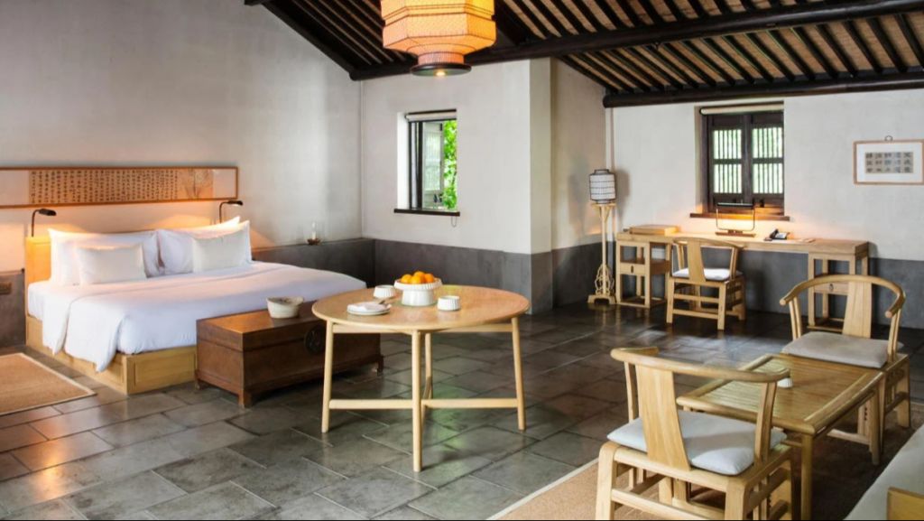 The 46 residences feel more like private homes in a familiar hillside settlement than hotel rooms. Interiors draw on local materiality like stone, wood, subtle calligraphy, and muted tones. Many rooms open onto private or semi‑private courtyards where you can sit with your morning tea. Larger suites and villas extend living space with separate sitting areas and, in some cases, a private massage room, blending Jiangnan heritage with discreet comfort for longer stays.
