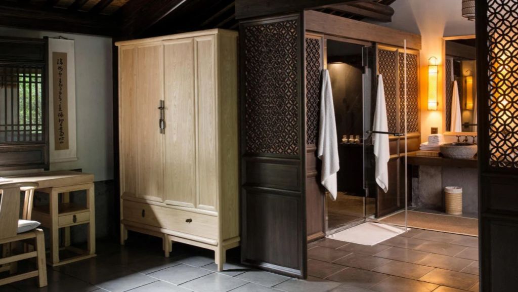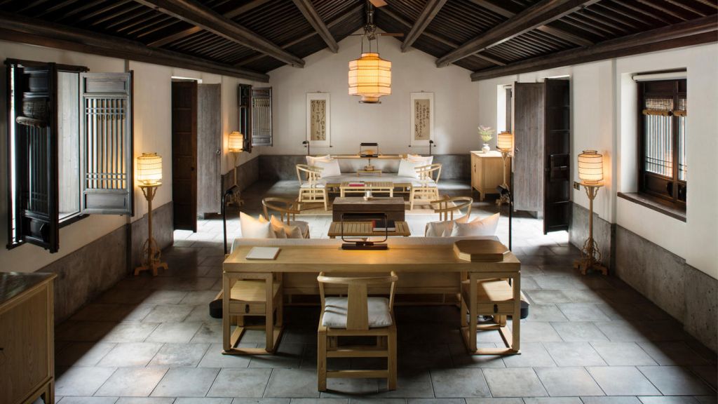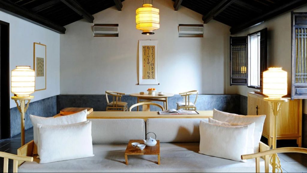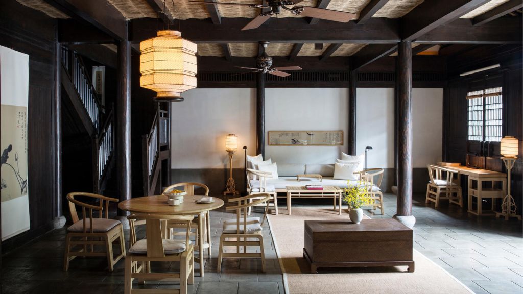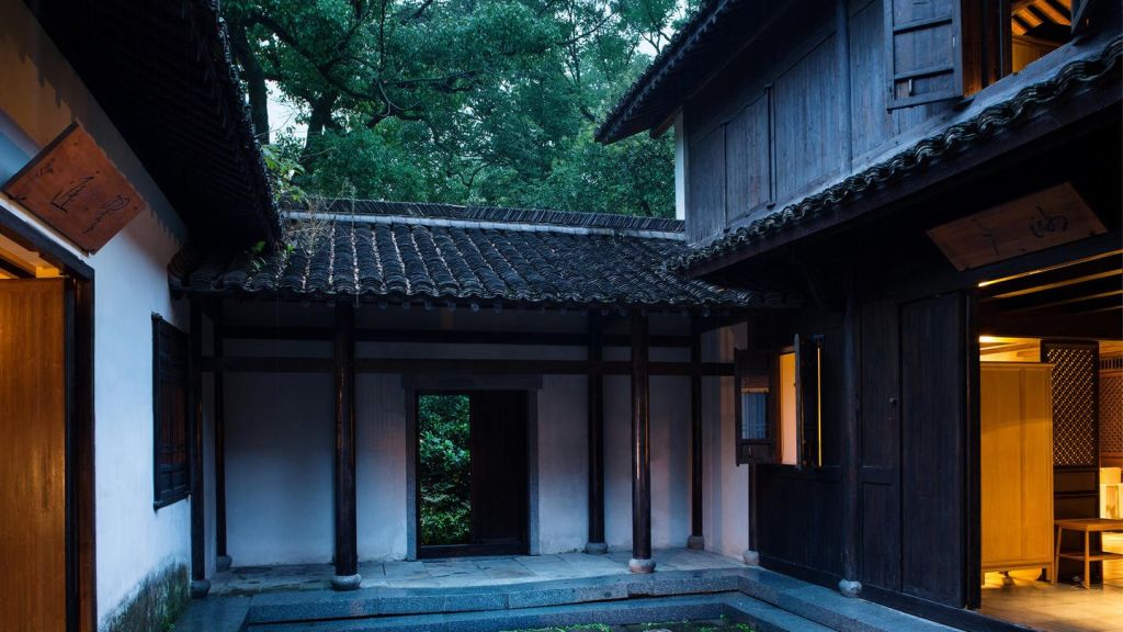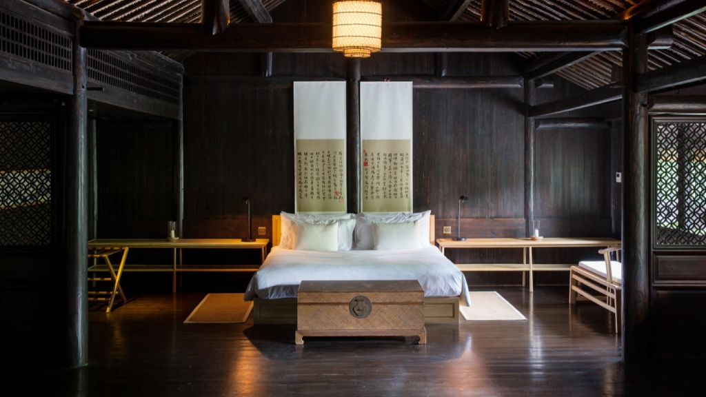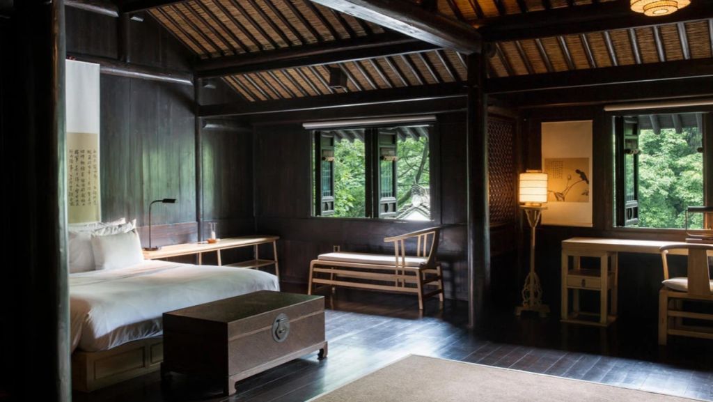 The 46 residences feel more like private homes in a familiar hillside settlement than hotel rooms. Interiors draw on local materiality like stone, wood, subtle calligraphy, and muted tones. Many rooms open onto private or semi‑private courtyards where you can sit with your morning tea. Larger suites and villas extend living space with separate sitting areas and, in some cases, a private massage room, blending Jiangnan heritage with discreet comfort for longer stays.