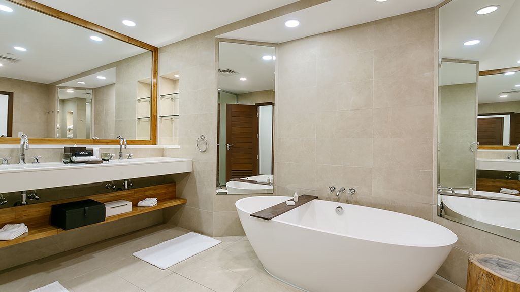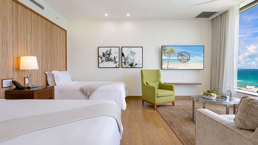 700 sqft set to inspire, our oceanview deluxe room double boasts natural woodwork as an ode to anguilla¿s sailing history and includes two full beds, a seating area, large walk-in closets, and floor-to-ceiling windows with an ocean view from our tower. Additional amenities a 43" flat-screen tv, espresso machine, mini-bar, stunning bath with double sinks, shower, and alissa freestanding tub.