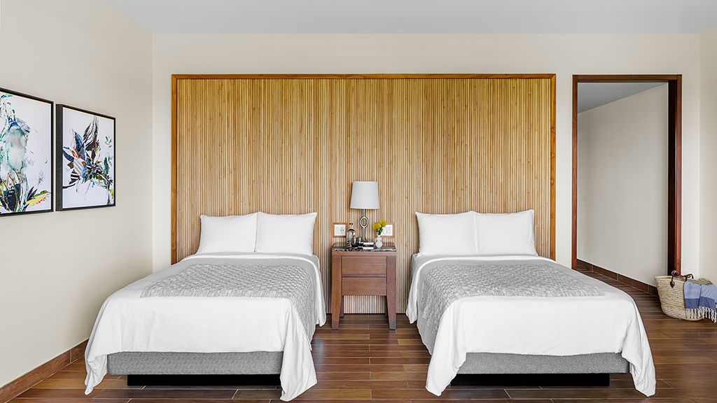 650 sqft enjoy a beach front view with a relaxed luxury aesthetic in our ocean front junior suites double which include two full beds, a large seating area, and an exquisite california-style closet. Additional amenities include a 43" tv, espresso machine, mini-bar, stunning bath with double sinks, shower and alissa freestanding tub, and a private 175 sqft balcony. - butler service offered - connecting room options available