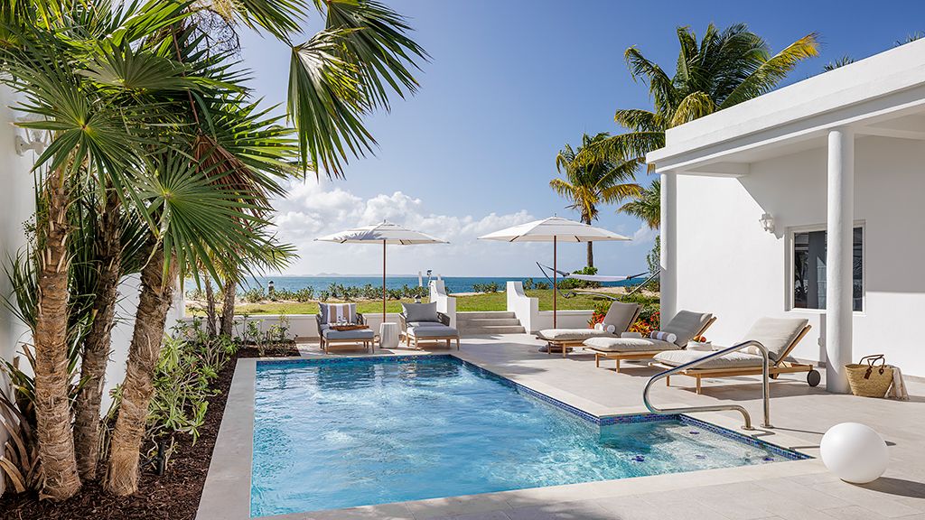2, 650sqft plus 4, 000sqft outsidethis spacious beach front home, serves as a private oasis at aurora anguilla and includes a private pool, a master suite with beach views, a solarium, two additional en suite king bedrooms, a living room, a dining area, a full kitchen, a powder room, and an outdoor shower. Additional amenities include complimentary wi-fi, flat-screen tvs, a mini-bar, a nespresso machine, dedicated butler service, laundry, continental breakfast, and twice daily housekeeping.