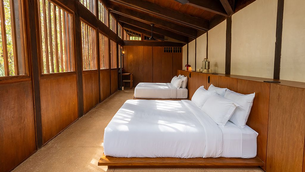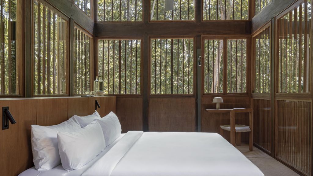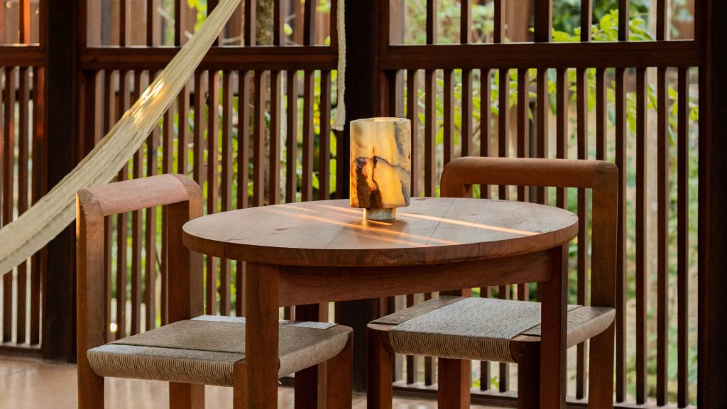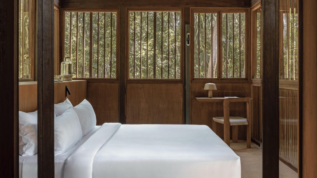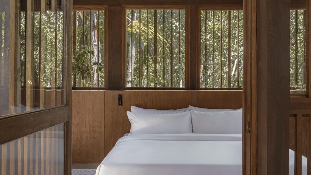 Each of the 22 treehouse-style villas is immersed in lush jungle, carefully built around the existing mangroves to minimize environmental impact. These warmly textured spaces have primarily been constructed using upcycled and salvaged materials, with pops of color from custom artwork created by local artisans. An on-site wastewater treatment system ensures no water waste enters the lagoon.