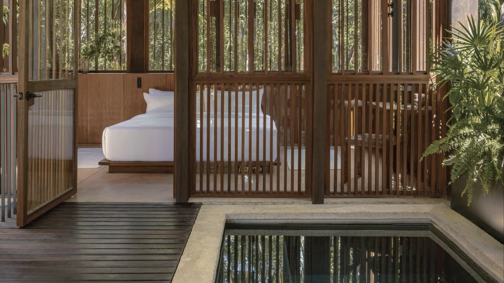 This stunning two-bedroom villa is ideal for families or friends traveling together with ample space to relax together, including the 6.6sqm plunge pool. 104sqm (1, 119sqft) king and queen beds jungle and partial lagoon view private plunge pool complimentary wi-fi rain shower one bedroom has a king-size bed while the other carries two double-size beds. This is sustainable tropical modernism at its best with elevated rooms to be as low impact as possible to the environment. The well-ventilated rooms come alive thanks original artwork from local artists and locally made furniture from recycled materials such as wood. The minibar is filled with an assortment of mexican gourmet products. The rooms provide a screen detox so you can truly connect with nature. This villa can be booked with the two rooms or separated. Sleeps 6.