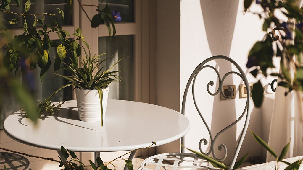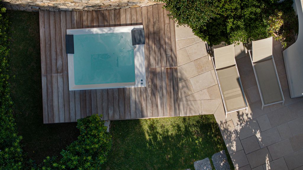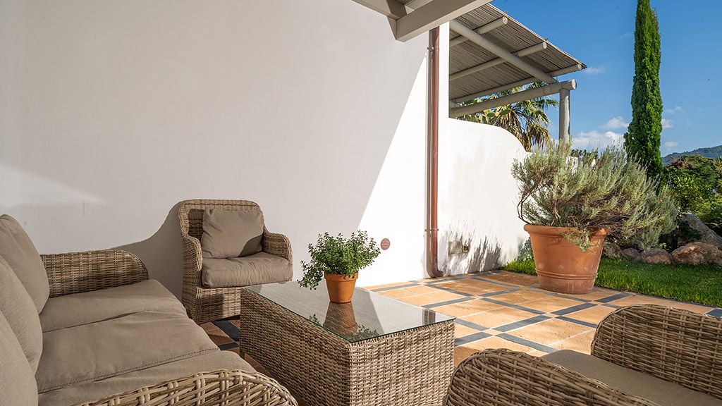 Room with king bed, garden view and furnished terrace with a mini Jacuzzi.