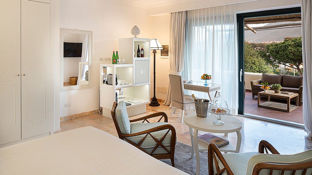 Junior Suite with king bed, sofa bed, walk-in closet and terrace with garden view and Jacuzzi.