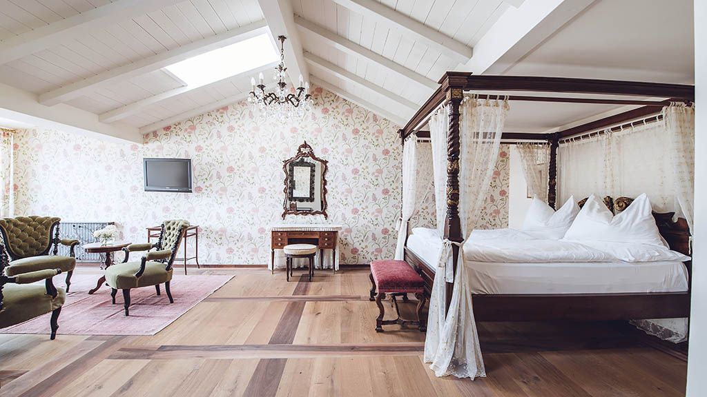 1 king size bed – 70sqm / 753sqft – seating area for lounging – wood flooring – walk-in wardrobe – balcony and terrace – garden view – with spectacular views of the enchanted castle garden and the beguiling texel group, this suite is the perfect place to spend warm summer evenings by candlelight, listening to the nightingales sing on your terraces and balcony. Treat yourself to a stay fit for a king or queen in well-lit suites with high ceilings, decorated with exquisite materials and wallpaper, antique furniture, and a genuine flair for noble atmosphere. The bathroom also boosts an infrared sauna and spectacular views, which can be enjoyed from the comfort of the panoramic bathtub – en-suite bathroom with monsoon shower and bathtub – hairdryer – bathrobes and slippers – natural and plastic-free toiletries – homemade body creams and alkali salts – complimentary wi-fi – flat-screen television – telephone – air conditioning – safe – minibar – 2 extra beds possible (on request) – charges apply – 4 persons maximum