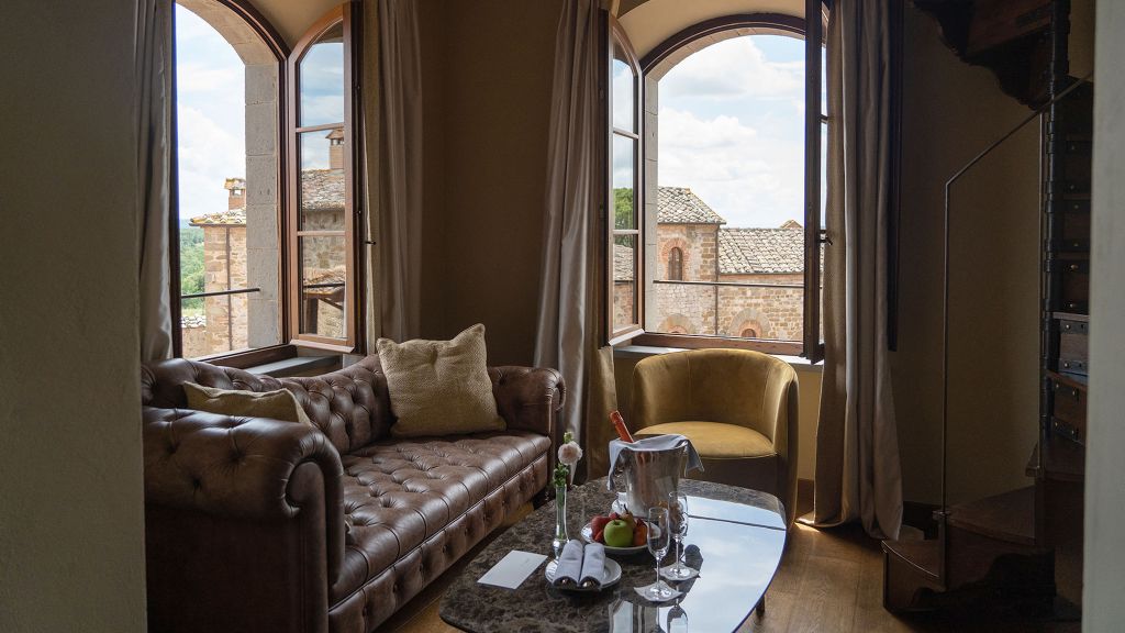 A truly unique hideaway featuring a romantic private lookout with enchanting views over the iconic piazza and the countryside. A spacious suite of 40-60 square metres with a separate bedroom and lounge area. Experience timeless elegance, heritage and style with warm colours and refined furnishing and textiles, surrounded by nature while overlooking the monastery. Complimentary access to spa monasterii. City tax eur 5.00 per night, per person.