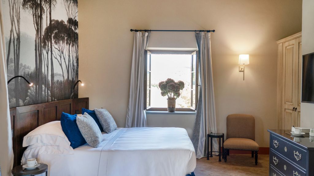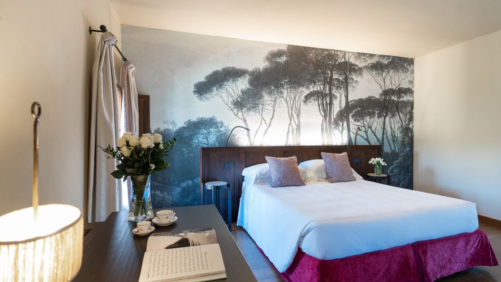 Designed for a charming and relaxing stay in two the stylish 32-45 square meters deluxe rooms reflects the essence of an intimate tuscan hideaway while allowing the possibility of adding a cot. Specially crafted giant wallpapers reflecting trees and landscapes, warm tones and precious textiles create an intimate and warm atmosphere while, living in an ancient castle, the beauty of the castle and the countryside can be admired from every window. Many of the bathrooms feature a separate bathtub and shower. Some bedrooms can be connecting. Complimentary access to spa monasterii. City tax eur 5.00 per night, per person.