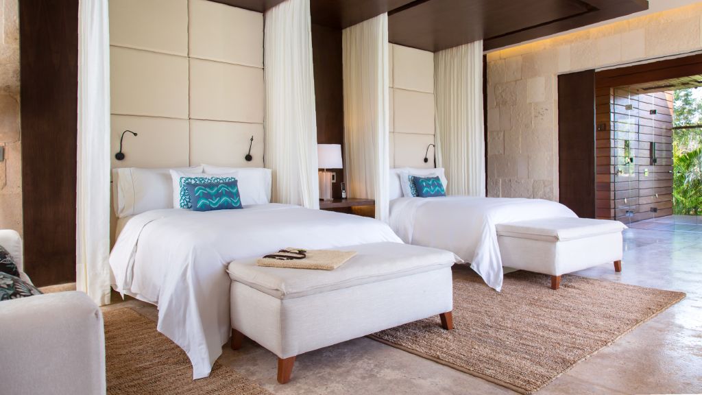 Family Villa have two bedrooms and are set in the Mayan jungle. They are contemporary, air-conditioned, with local rich woods and stone, outdoor swimming pool, shared living area, one room with King size bed, and second room with 2 queen beds