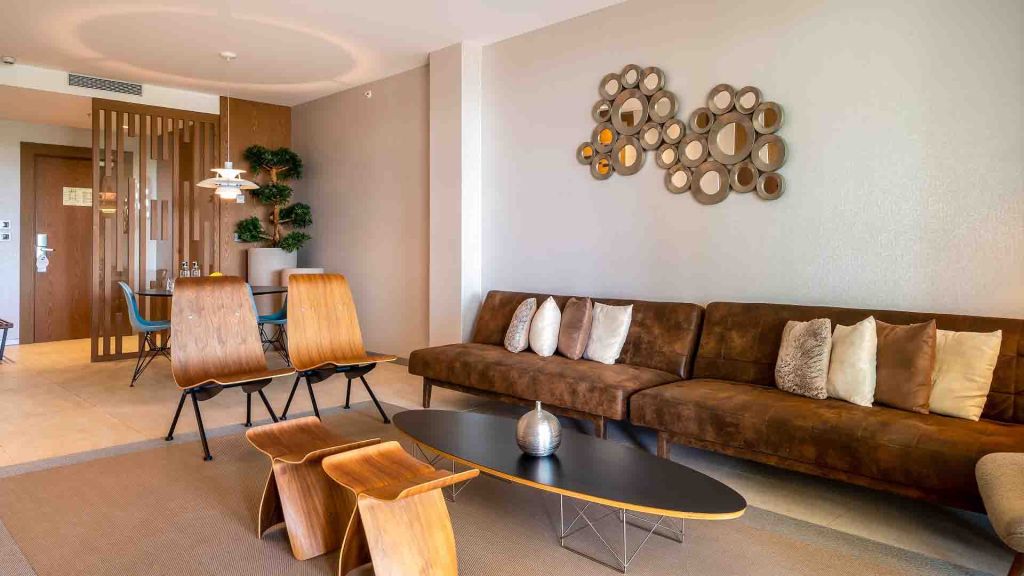 Experience a blend of style and functionality in our brand-new junior suite, featuring a charming andalusian-inspired decor. With a generous layout of up to 36 m², this suite features an additional living area with a comfortable sofa bed, perfect for relaxation or entertaining. Unwind in the elegantly renovated bathroom equipped with either a shower or a soaking tub. Located on the first and second floors with a southern orientation, these suites also boast a private 6 m² terrace. This room is also ideal for families and can accommodate up to 2 adults plus 2 children with the convenience of a pull-out sofa bed.