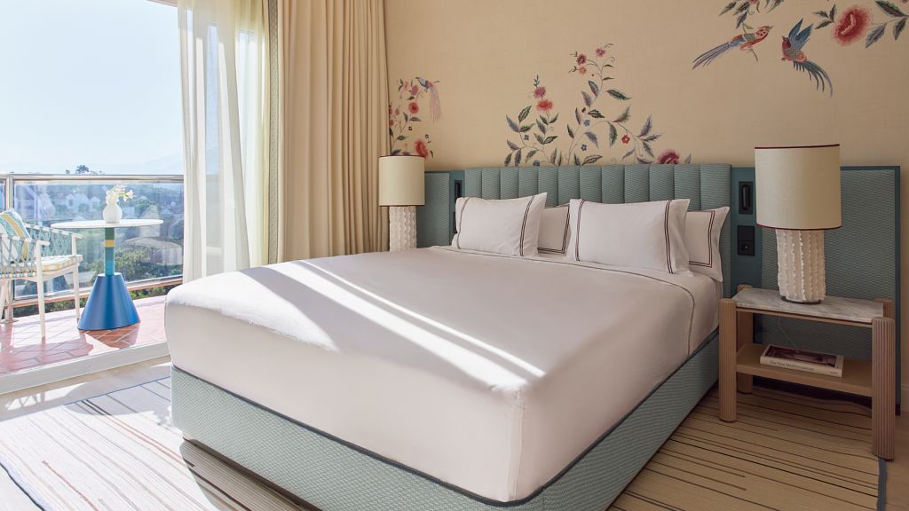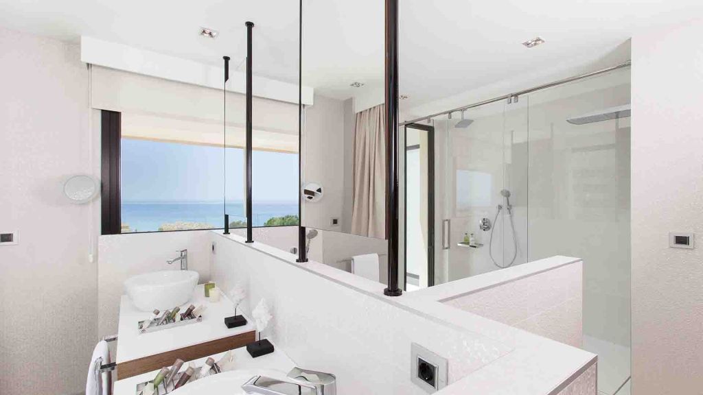 Bright and spacious, our 38 m² rooms seamlessly blend contemporary style with subtle ethnic accents. Inspired by mid-century design, these rooms feature reinterpretations of iconic pieces, creating a timeless and sophisticated atmosphere. Each room boasts a 11 m² private terrace, perfect for enjoying peaceful outdoor moments while soaking in breathtaking sea views. The luxurious bathrooms are designed to impress, offering large windows and the choice of either a dual rain shower with waterfall option or a relaxing bathtub. Located in the most tranquil zone of the hotel, these rooms span across floors 1 to 4.