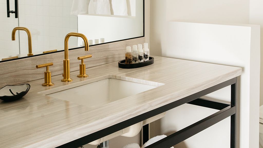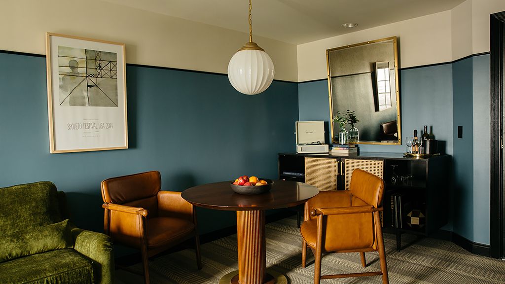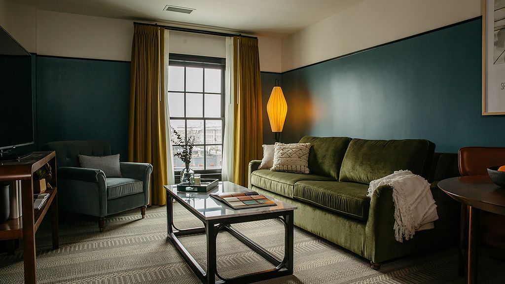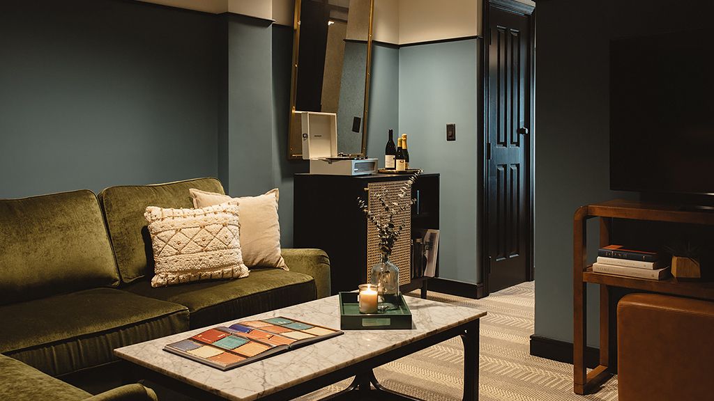 One king bed + living room with sofa bed | 450 sq ft. | designed for relaxation, our premier one bedroom suite features a king bed with lush velvet accents, and plenty of private space in the separate living area with sleeper sofa and dining table. Outfitted in each en suite bath are gracious marble vanities and custom scent amenities by red flower. Drift off to pure sounds from your in-room turntable and vinyl.