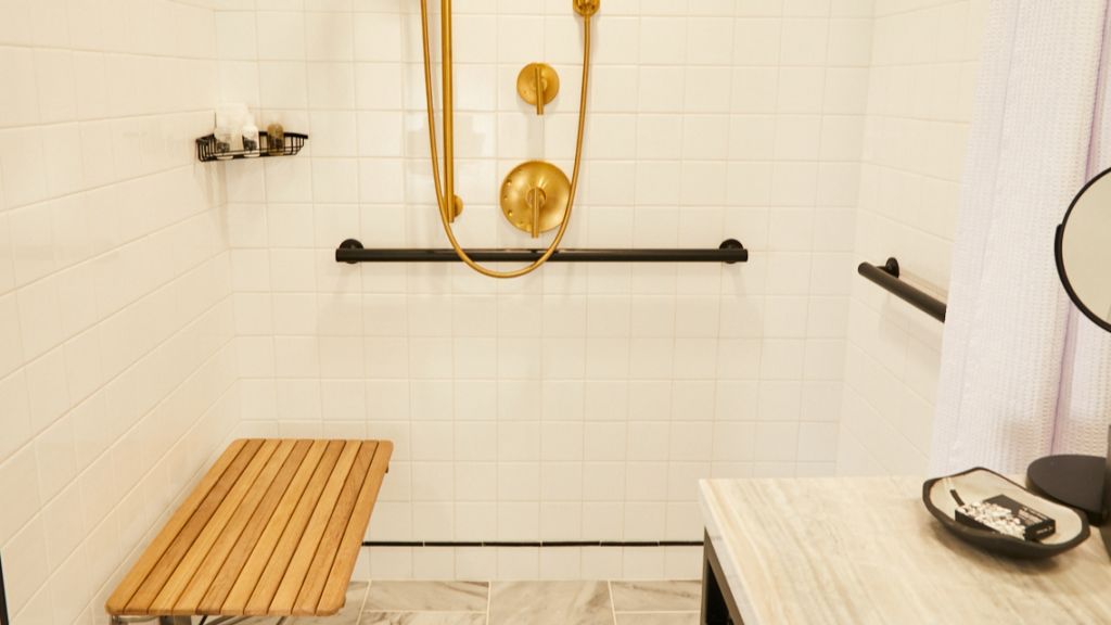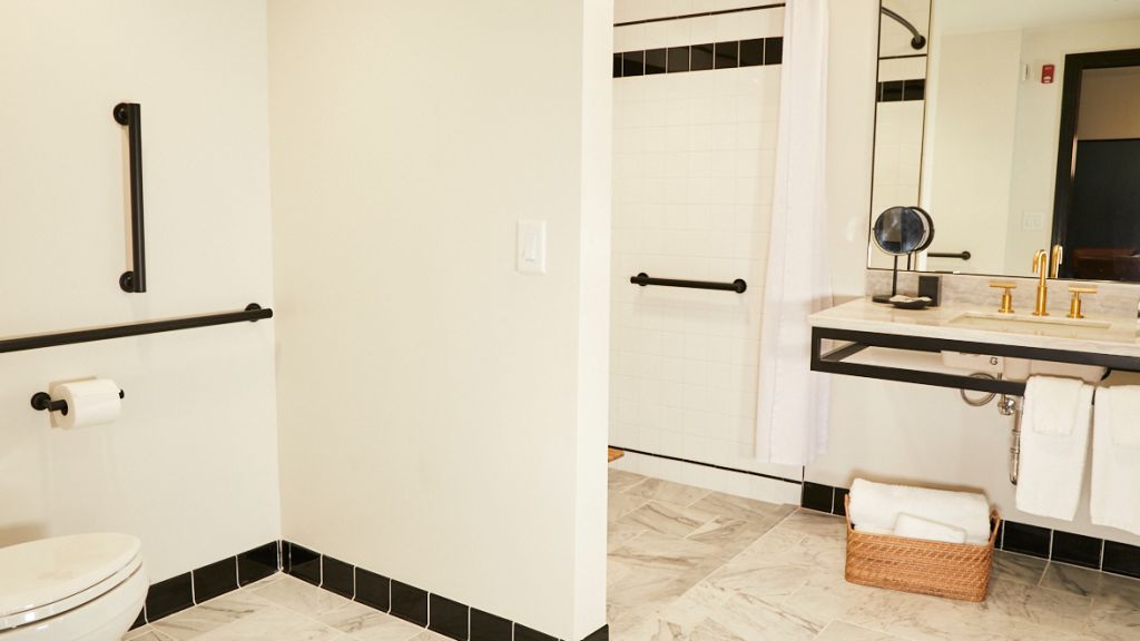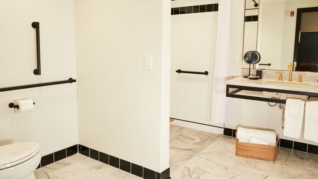 One king bed + living room with sofa bed | 450 sq ft. Designed for relaxation, our premier one bedroom suite accessible series offers a king bed with lush velvet accents, and plenty of private space in the separate living area with sleeper sofa and dining table. Outfitted in each en suite bath are gracious marble vanities and custom scent amenities by red flower. Drift off to pure sounds from your in-room turntable and vinyl.