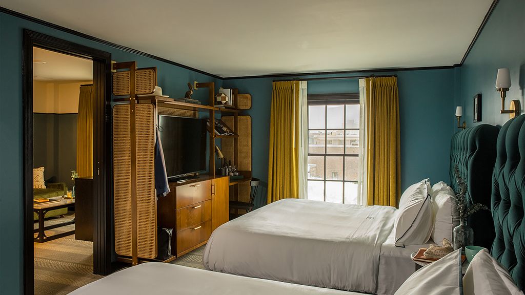 Two king beds + living room with sofa bed | 382 sq ft. Offering two king sized beds and a private parlor with sleeper sofa and work station. The one bedroom suite - 2 king features stylish luxuries, fully curated amenities, custom toiletries and warm accommodations for multiple travelers. With ample private living space, this spacious suite is suited for entertaining and sharing a story – or two – from your travels and beyond.