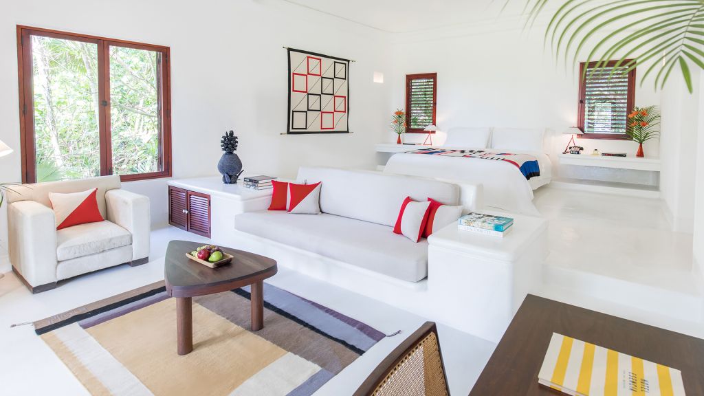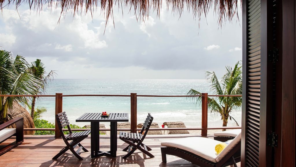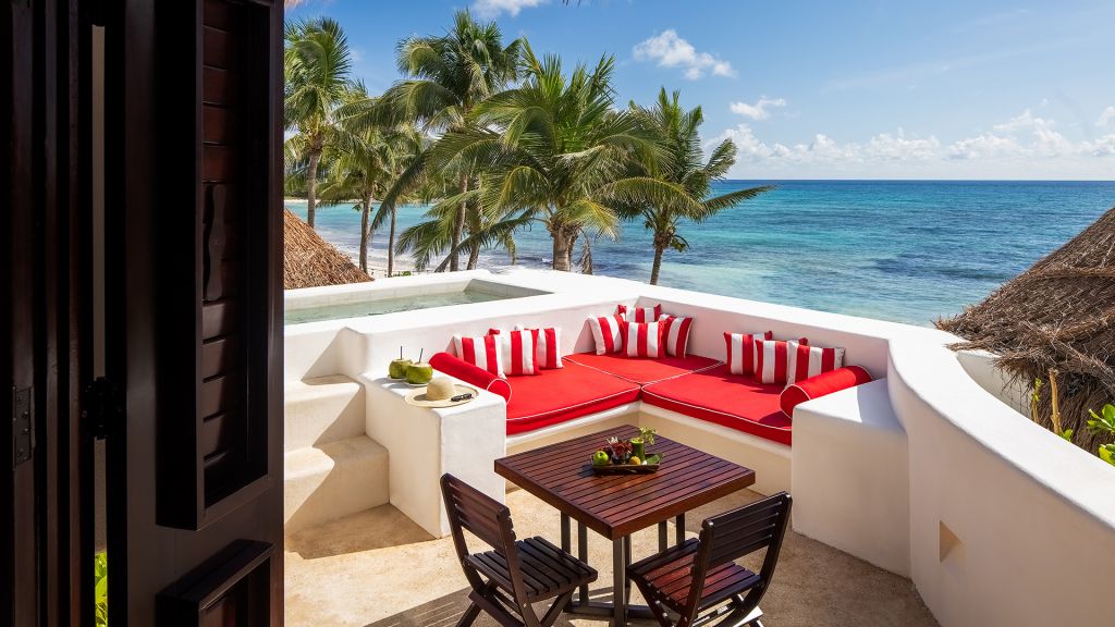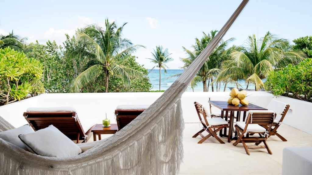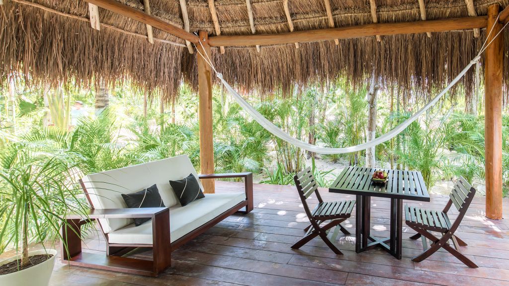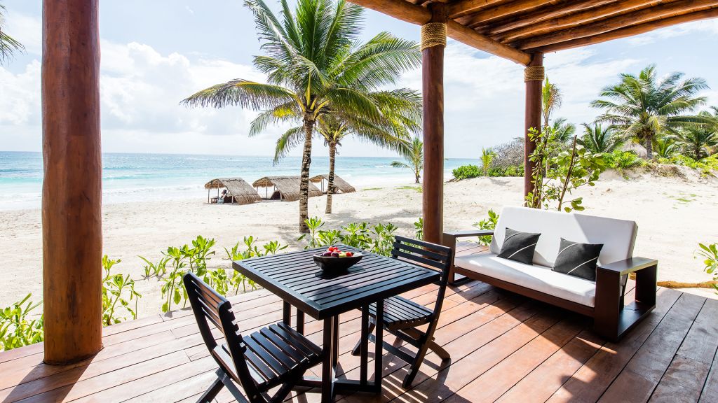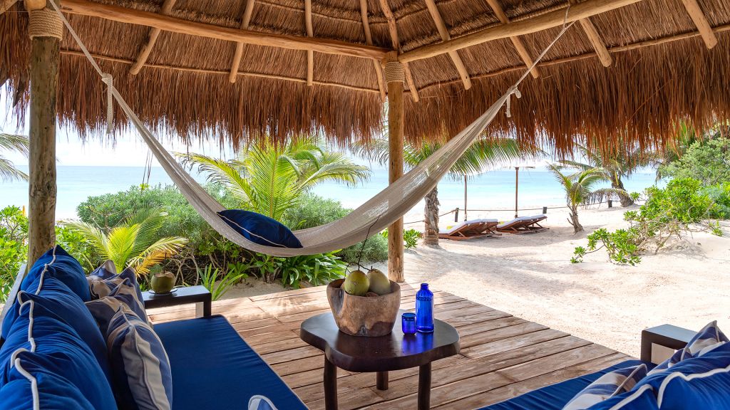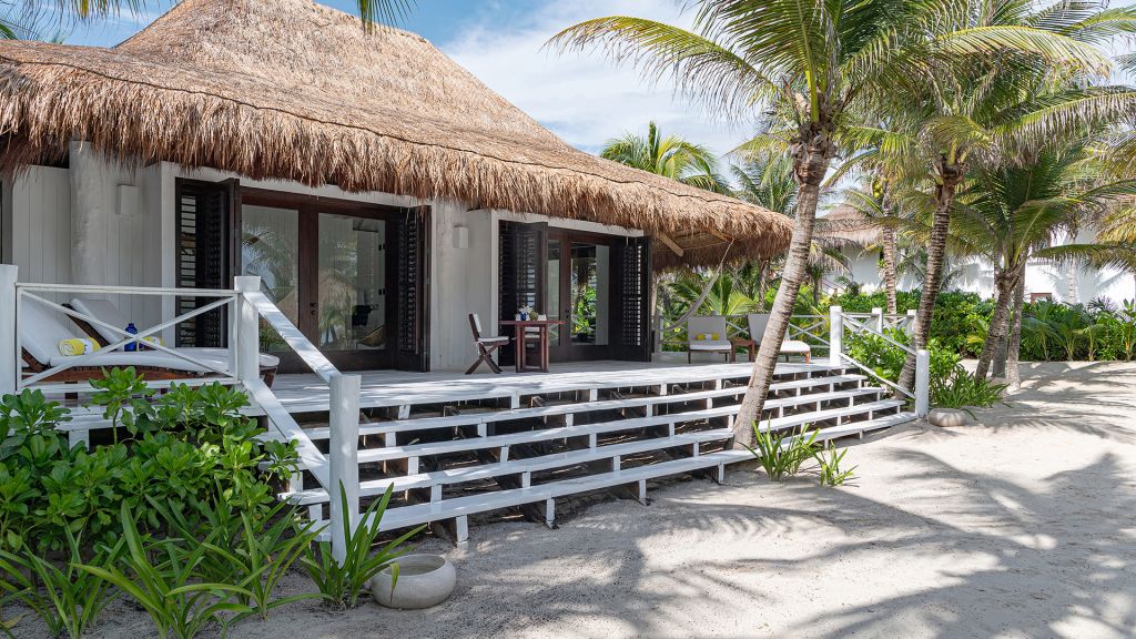 The most private suite on the property, this Caribbean style beachfront bungalow features all the comforts and signature amenities oh Hotel Esencia. This exceptional suite under a large palapa features a master king bedroom overlooking the sea, an adjacent living area convertible to a second bedroom.