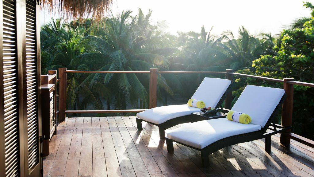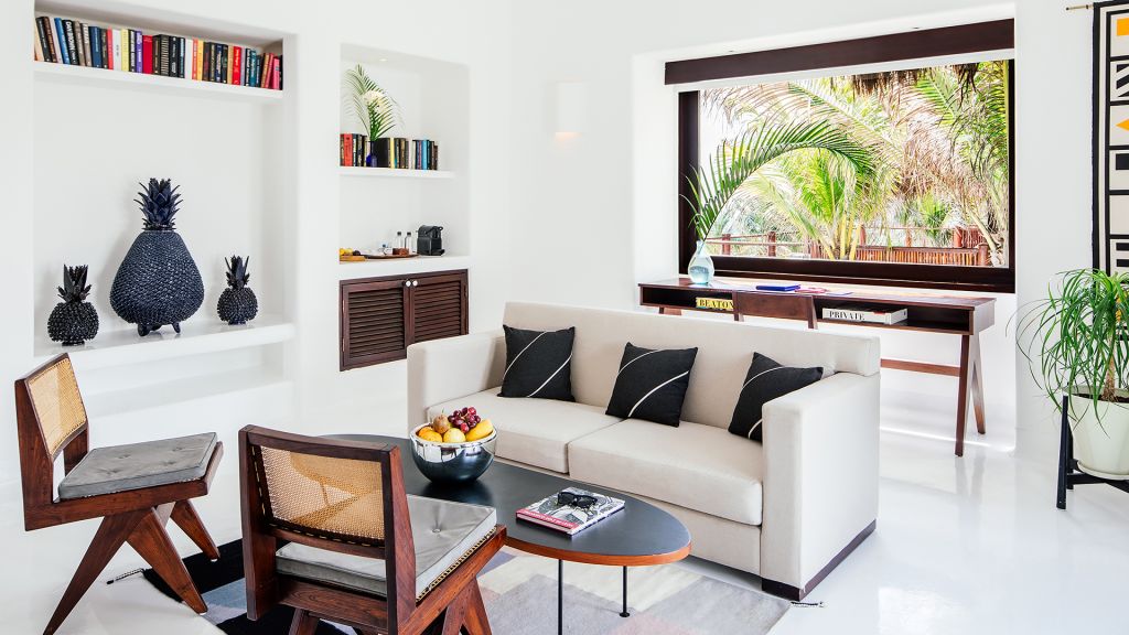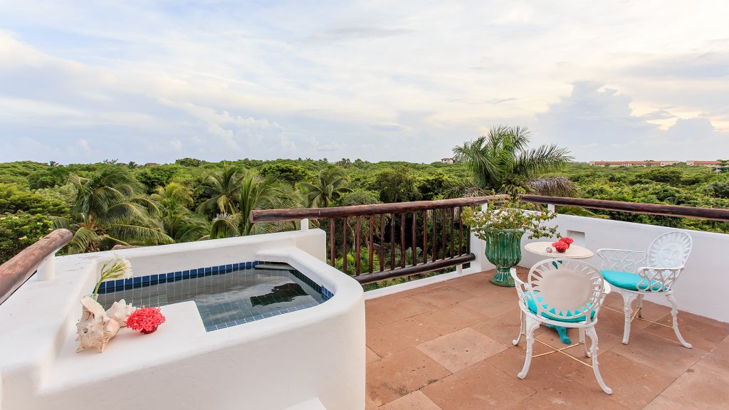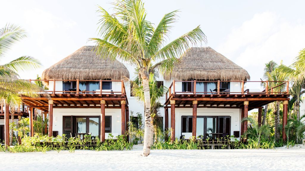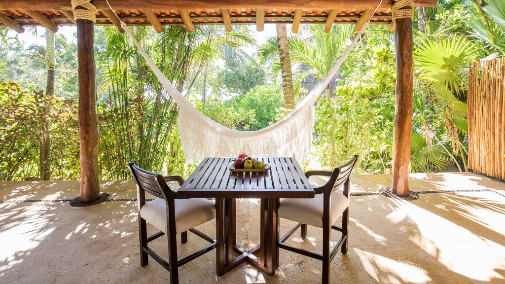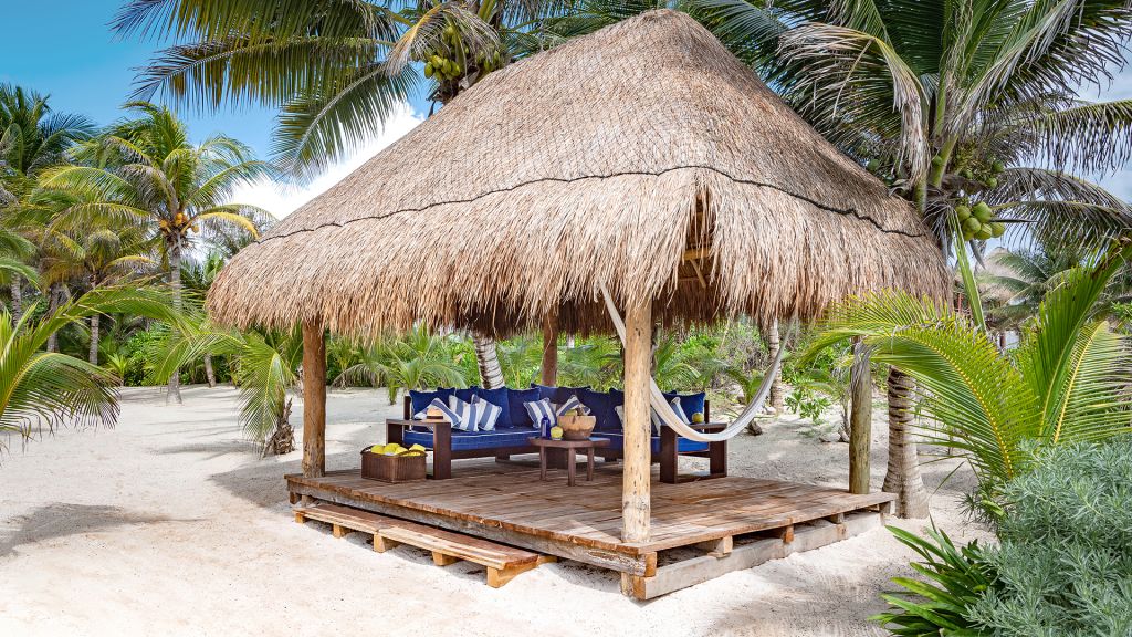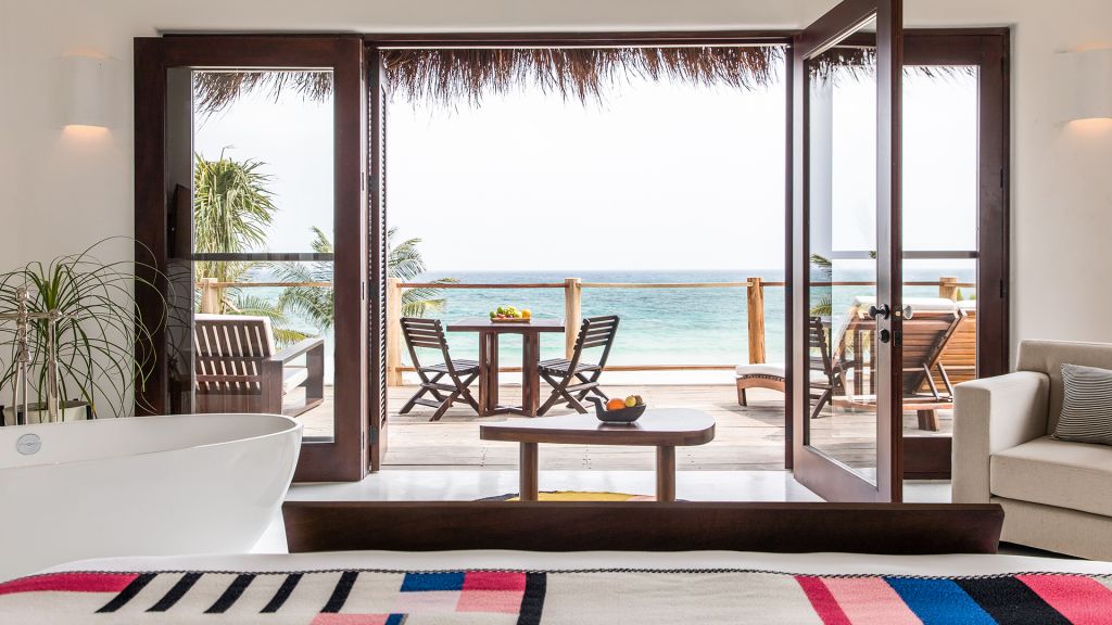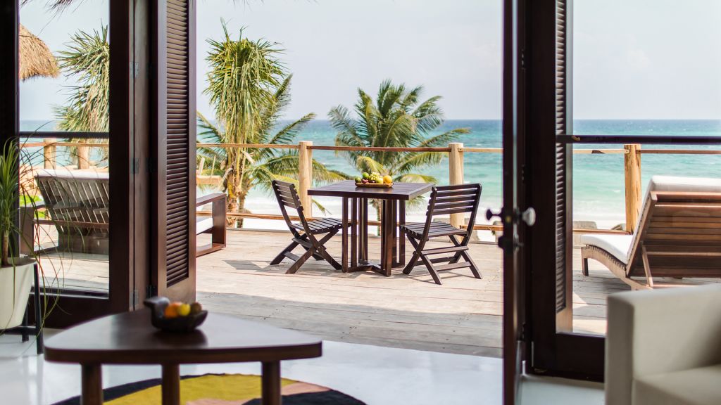 The most private suite on the property, this Caribbean style beachfront bungalow features all the comforts and signature amenities oh Hotel Esencia. This exceptional suite under a large palapa features a master king bedroom overlooking the sea, an adjacent living area convertible to a second bedroom.