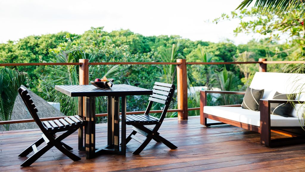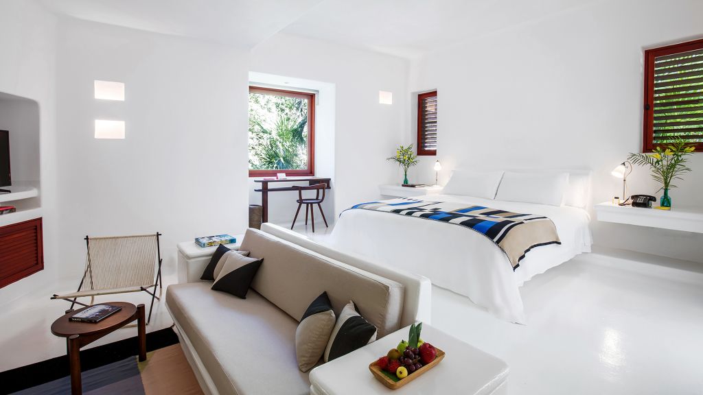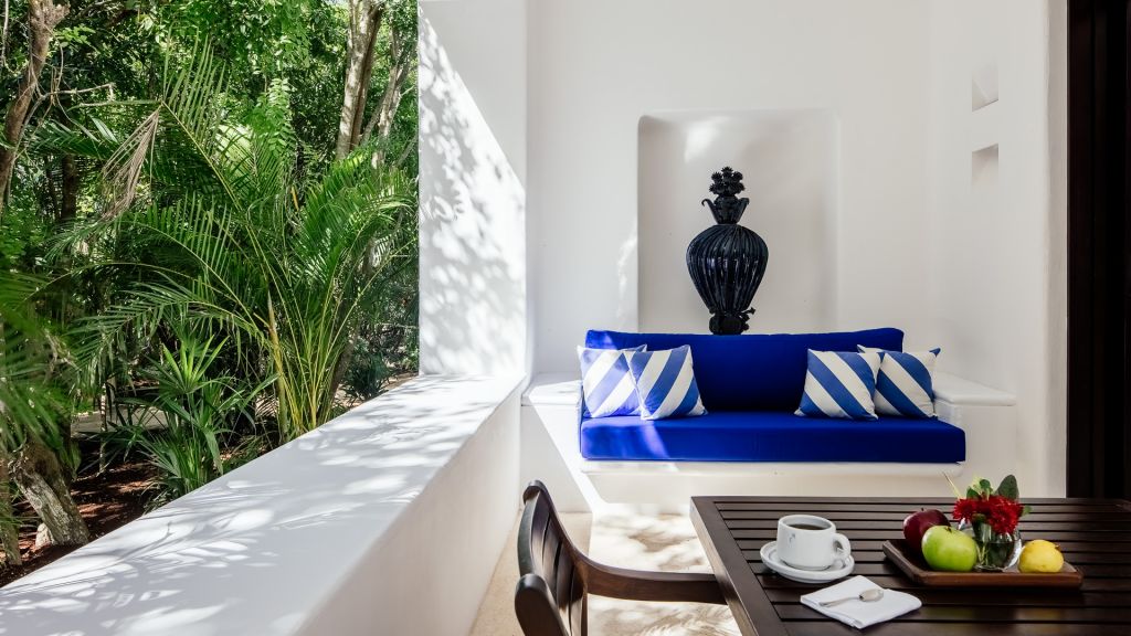 These quiet, cooling sanctuaries encircle the estate’s tropical gardens. Available with one king or two queen beds, these spacious suites have a large private outdoor dining terrace with sofa and feature extra large all-white bathrooms with double showers, double sinks, an in-room double bathtub, walk in closets, wide-screen smart TVs, bluetooth speakers, air conditioning, and all of Hotel Esencia’s signature amenities.