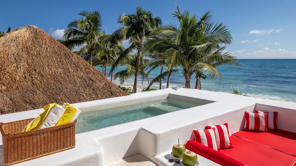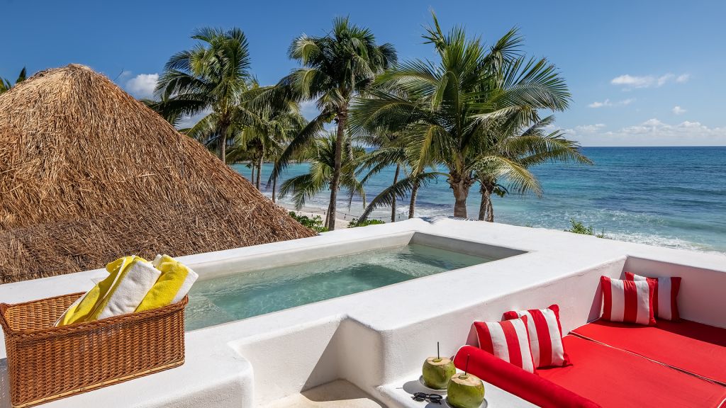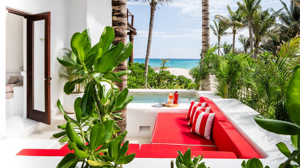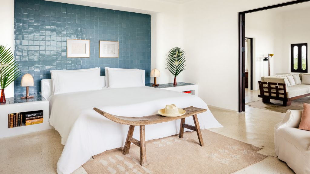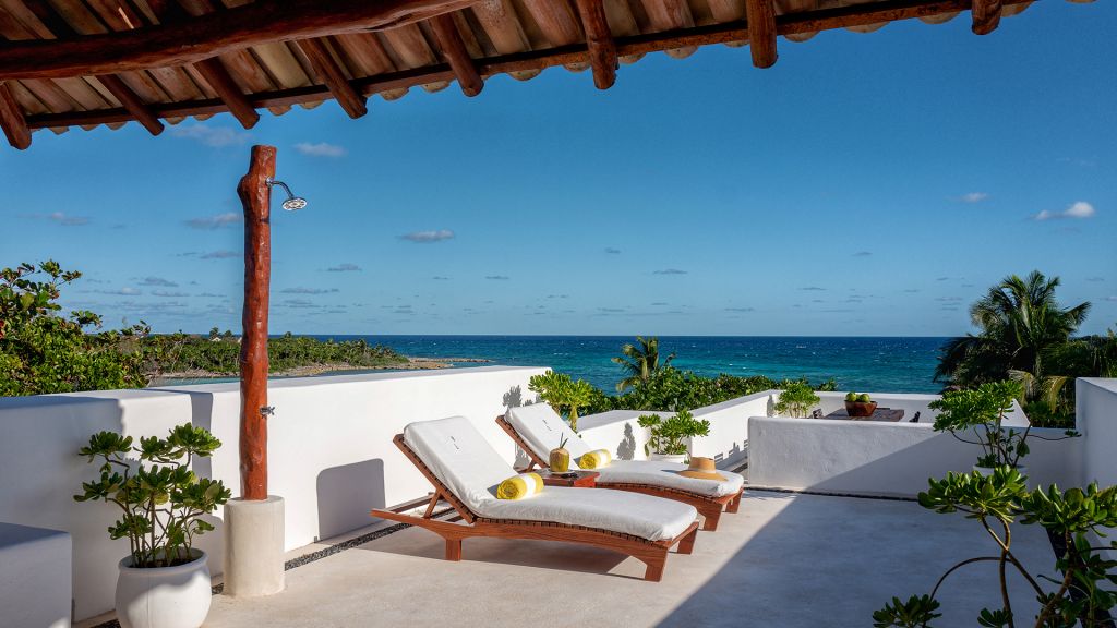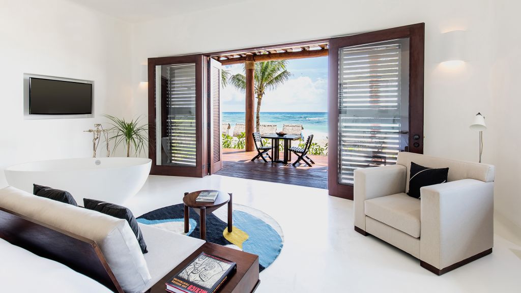 Barely 20 meters from the sea, Beach Suite features a private beachfront terrace, spacious bathrooms including double showers with direct ocean views, an in-room double bathtub, air conditioning, and all of Hotel Esencia’s signature amenities. All accommodations at Hotel Esencia feature walk-in closets, wide-screen smart TVs, bluetooth speakers, and all of Hotel Esencia’s signature amenities. 105m2 - Sleeps up to 3.