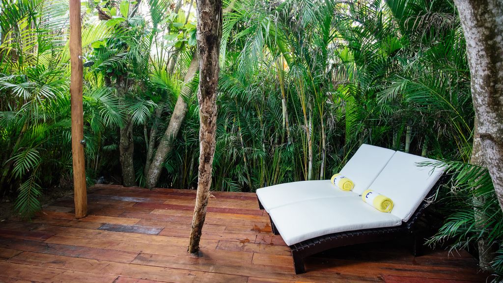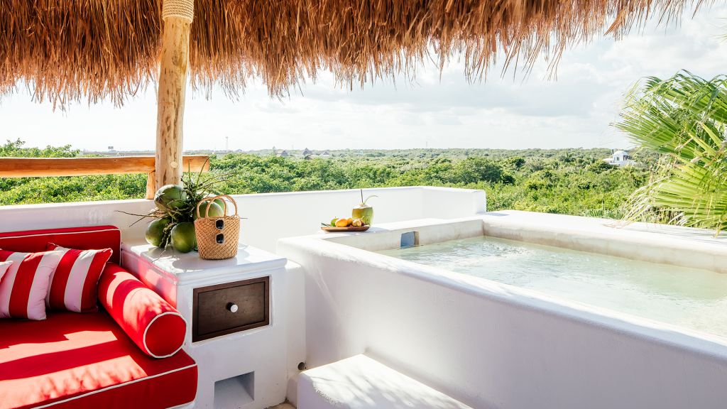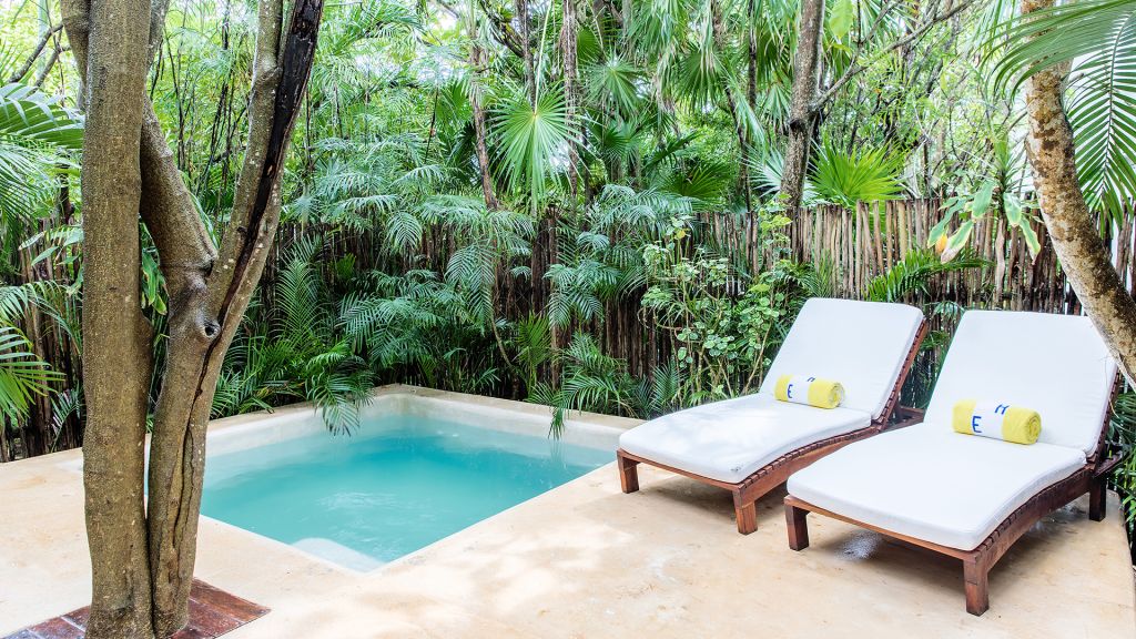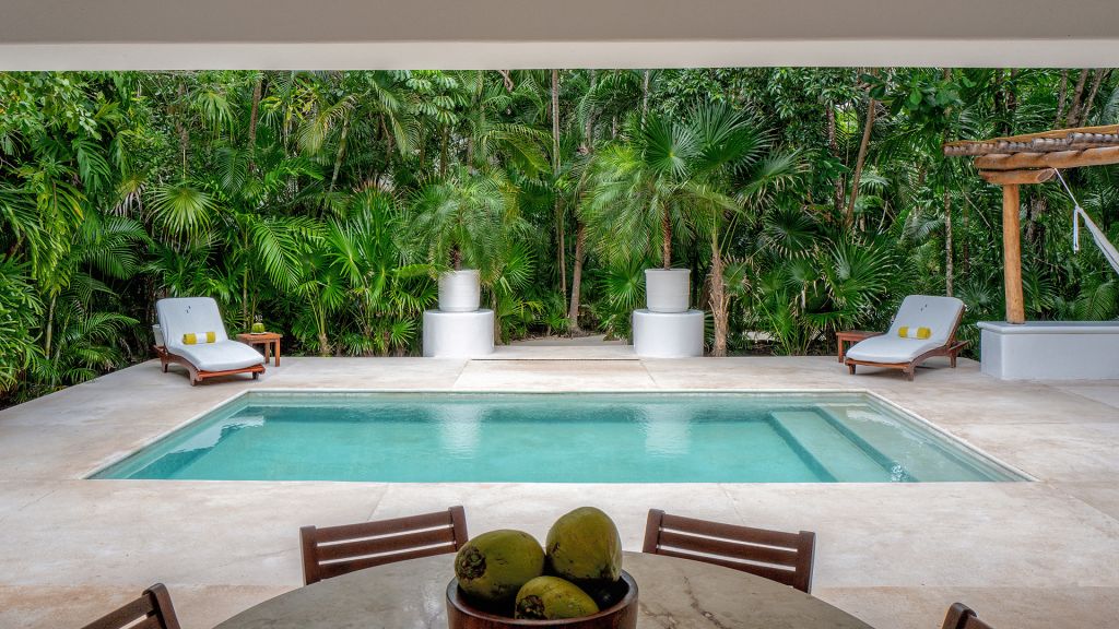 A plunge pool, rain-like shower room, one king bed, and spacious outdoor dining terrace with sofa distinguish every Jungle Suite with Plunge Pool, uniquely equipped for calm and restoration. Some suites feature an indoor plunge pool while in others it is featured outdoors within a terrace solarium. All suites in this category feature spacious bathrooms, walk-in closets, wide-screen smart TVs, and bluetooth speakers, and all of Hotel Esencia’s signature amenities. Bathtub upon request. 69 m2 - Sleeps up to 4.
