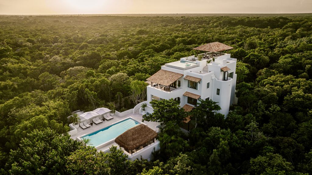 One of the most grand private villas in the riviera maya, this new 10, 000 sq ft. Villa is shrouded by nature and provides the ultimate in privacy and seclusion, yet less than a five minute walk to the beach, restaurants, spa, gym, and all hotel facilities. Our helicopter landing pad and private tennis court are just a few steps away. The esencia mansion 's four level layout features 4 bedrooms and a myriad of common spaces for the utmost comfort and refined living, ideal for a family vacation or friends staying together. The light-drenched master suite on the entire third level features a grand master bathroom with shower room, oversize bath tub, double sinks, an indoor / outdoor plunge pool, an adjacent private fitness studio, a private office, and a master living room that opens to a spectacular covered terrace overlooking the grand pool area below. The towering rooftop terrace offers a glorious 360 degree view, another large pool, sun beds, and a covered lounge. The three junior suites are delightful generous spaces complete with private outdoor terraces, ensuite bathrooms, walk in closets, and a studio lounge. The luxurious eat-in kitchen, connects to a breakfast terrace with spectacular views of the jungle. The 'heart of the villa¿, the main living room, features a wet bar and an adjacent intimate lounge for relaxing, a lounge terrace, and a spectacular dining terrace overlooking the large family pool a few steps below. The pool is a work of art in itself with its ceramic tiles designed by the artist marcel dzama, and its comfortable sun beds, umbrellas, and the thatched palapa for shaded lounging. A private screening room with comfortable seating for 20 guests will surprise and delight even the most discerning traveler – featuring the latest in audiovisual technology and a bar; perfect for a cinema night with family and friends. Sleeps up to 8 adults and 2 children.