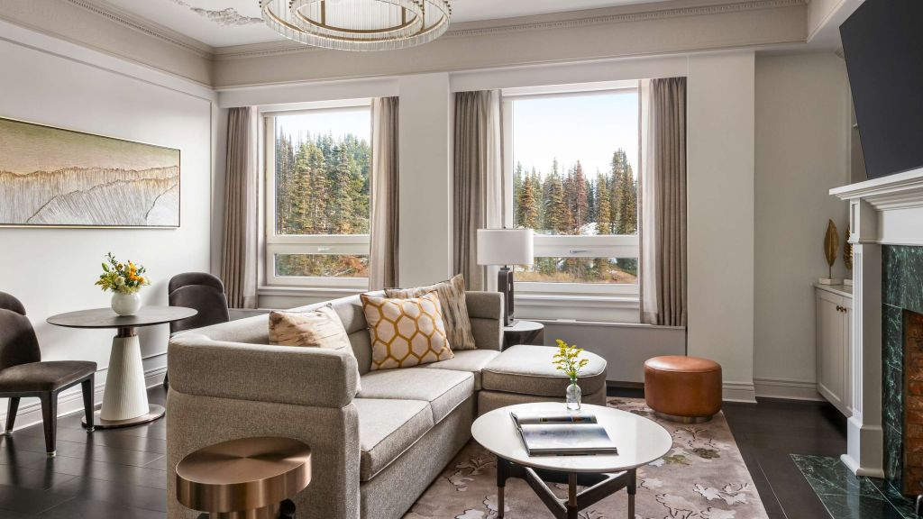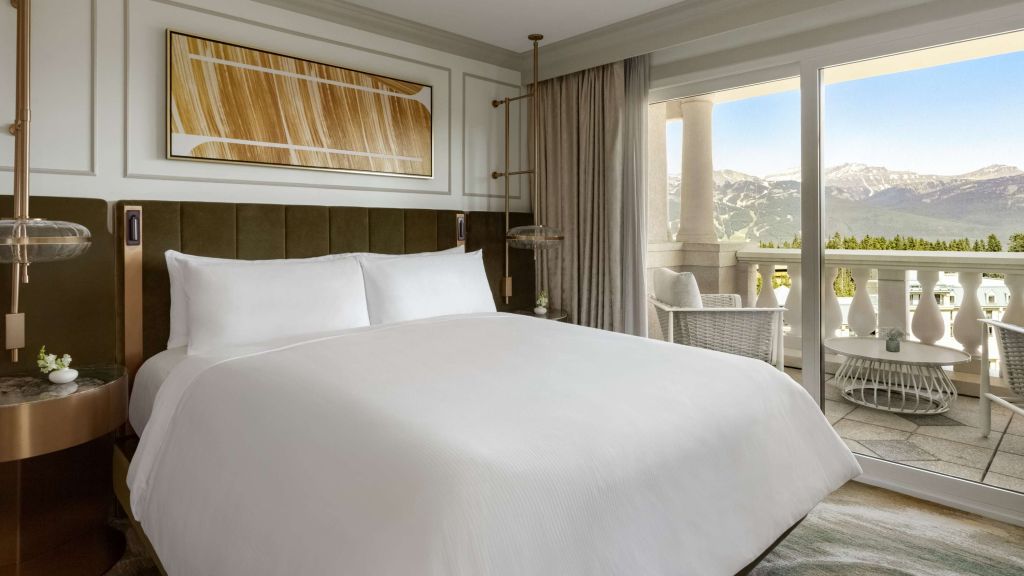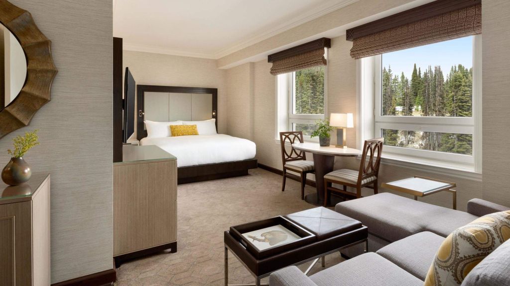 Features 1 King bed, Mt. Whitehorn views, sofa bed, living area, private balcony, dining area, powder room and ensuite bathroom. Includes complimentary breakfast, Gold Lounge access, TV, coffee maker, hair dryer, safe, kettle and Wi-Fi Internet.