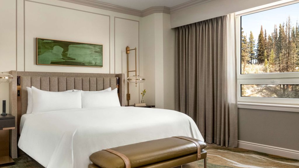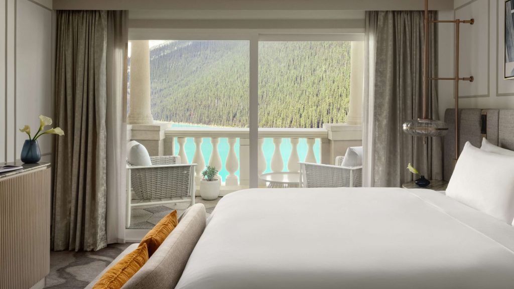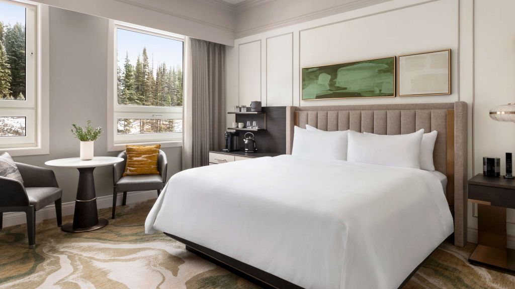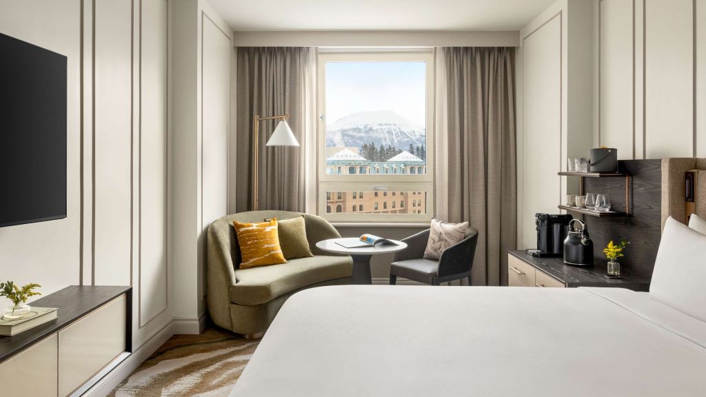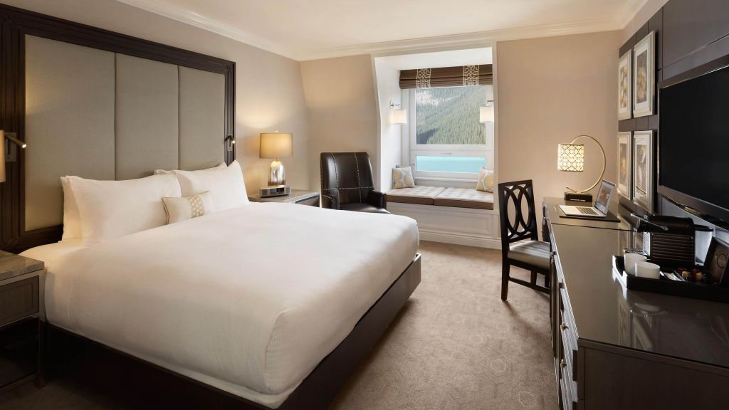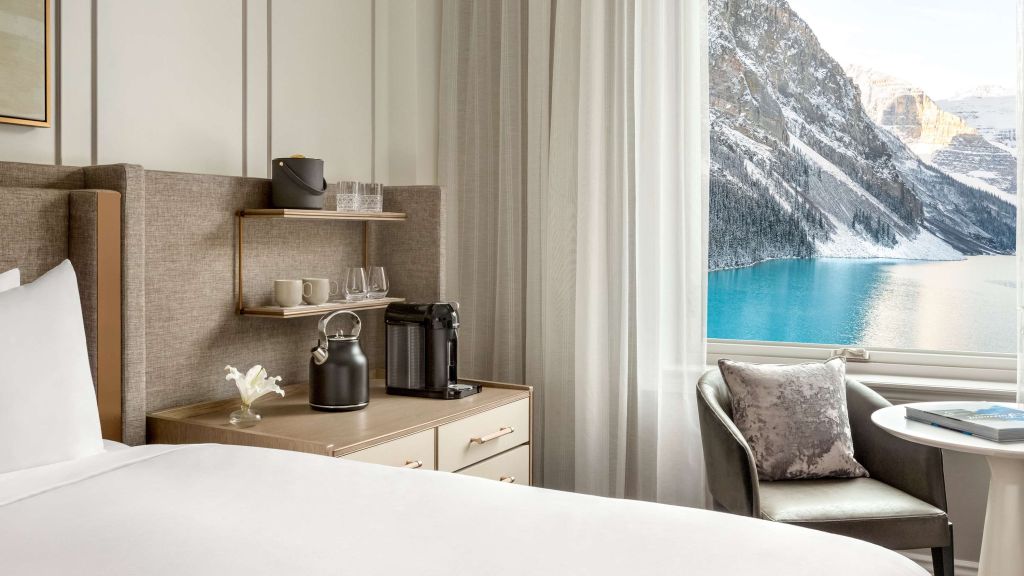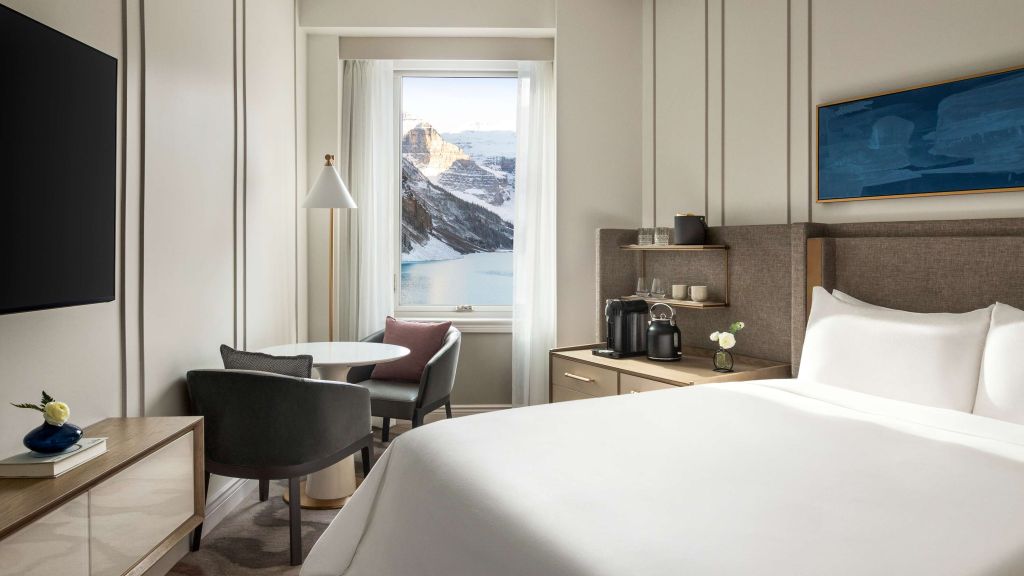 Features 1 King bed and views of Lake Louise and surrounding glaciers. Includes complimentary breakfast, Gold Lounge access, TV, coffee maker, hair dryer, safe, kettle and Wi-Fi Internet.