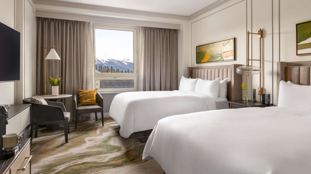 Features 2 Queen beds, views of the hotel grounds and mountain ranges and living area. Includes TV, coffee maker, hair dryer, safe, kettle and Wi-Fi Internet. Located in Mount Temple Wing.