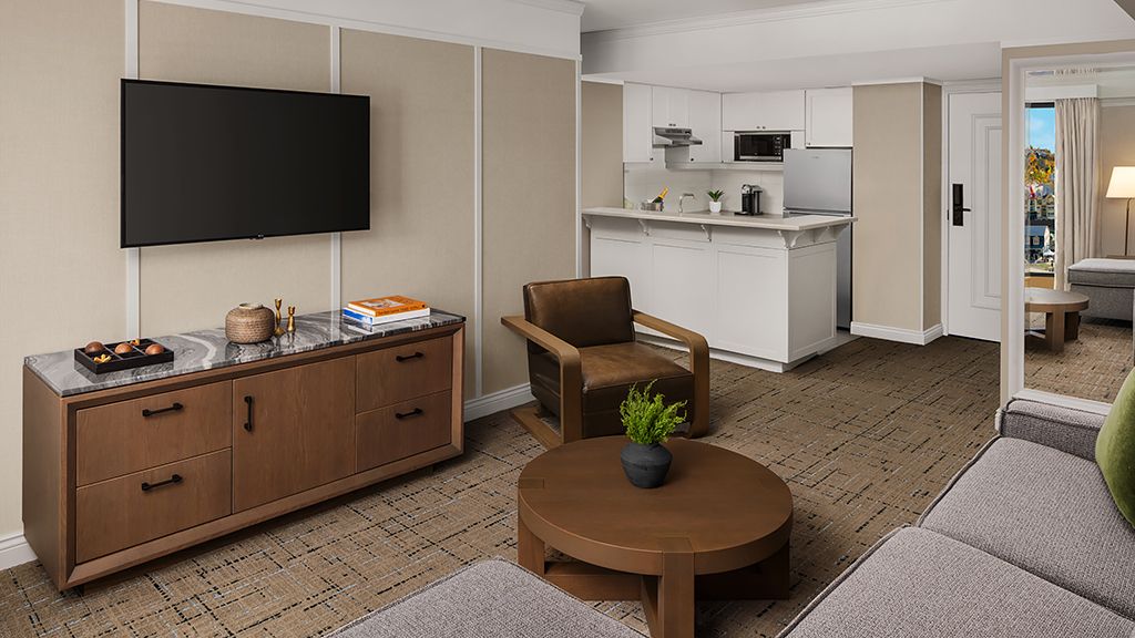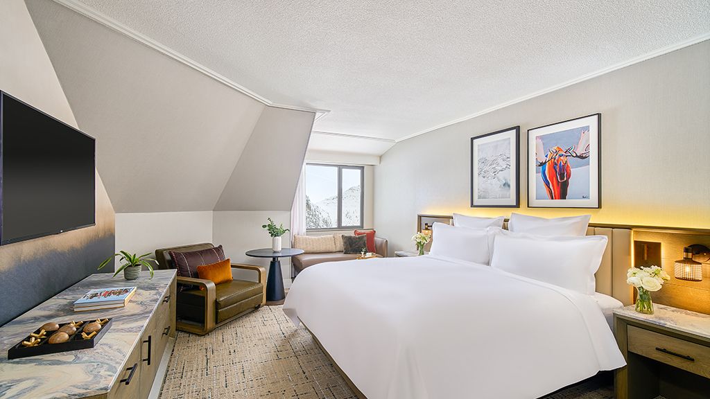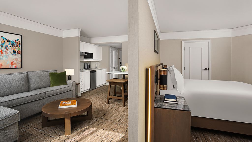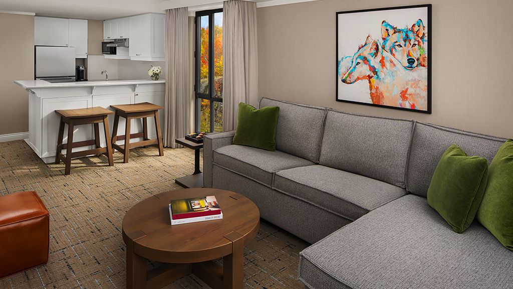 Newly renovated, contemporary alpine chic decor, living area with sofa bed, private bedroom with king bed, walk-in shower or bathtub. The One bedroom Luxury Suite features a private bedroom and a separate living room area with a sofa bed.