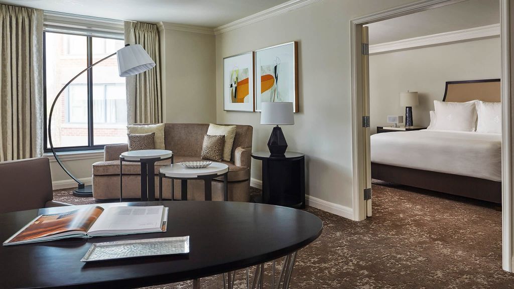 In the West Wing of Four Seasons Hotel Washington, DC, the Presidential Suite gets your vote. The one-bedroom space measures 1,924 sq. ft., traditionally decorated in blue, gold, and green. Original contemporary art adorns the walls, and the living area includes an eight-seat dining table and a service pantry. From the table or the plush lounge, you can see the lovely Chesapeake and Ohio Canal.