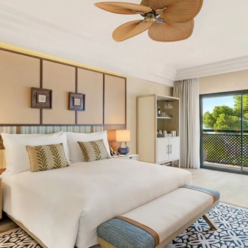 The deluxe king garden view offers an exclusive blend of elegance, comfort, and breath-taking natural surroundings. Designed for guests seeking a luxurious and tranquil stay. This room features exquisite mediterranean décor that enhances its serene ambiance. The spacious terrace provides magnificent views of the meticulously trimmed hotel gardens, infusing the room with natural light. This harmonious setting fosters an atmosphere of tranquillity and serenity, making it the ideal escape for leisure.