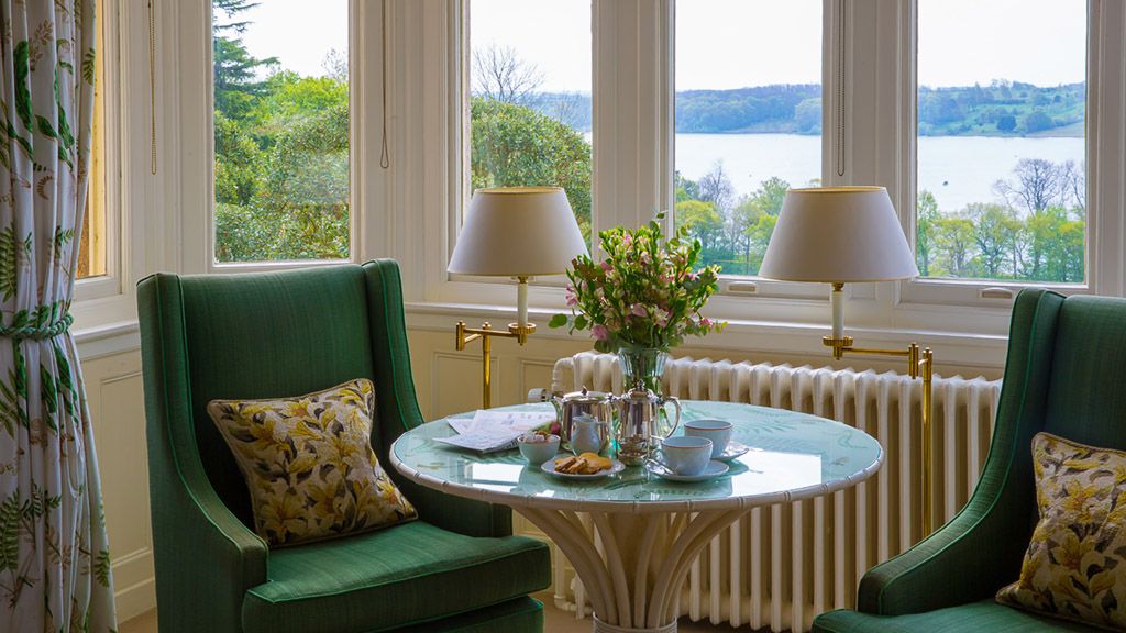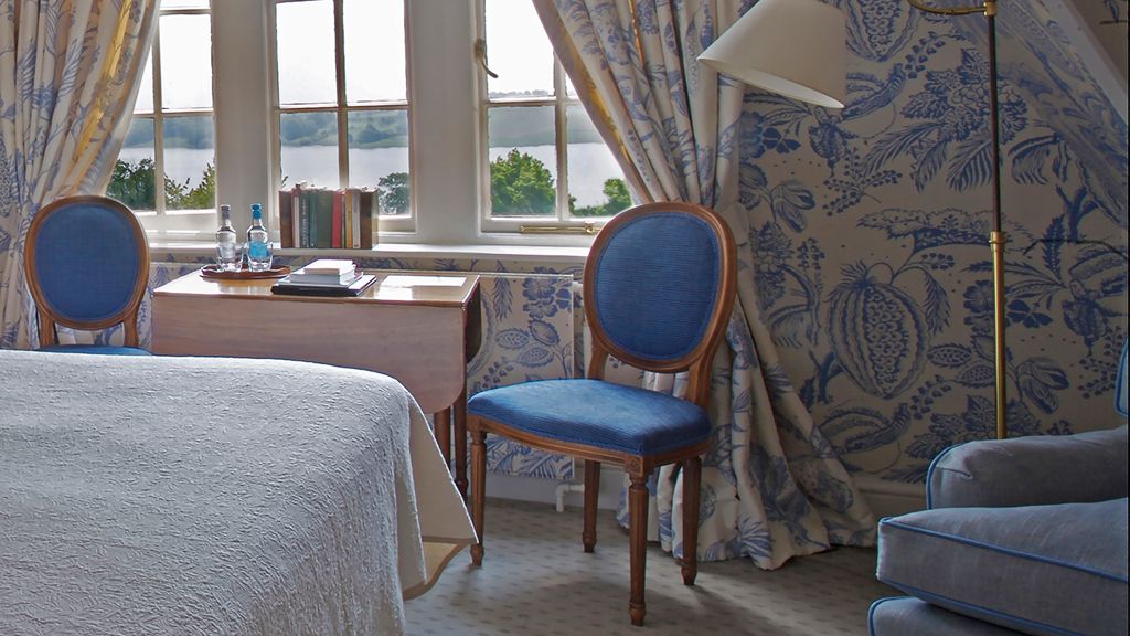 Room with 1 King bed or 2 Twin beds, breakfast table, desk, armchairs and a view of the lake.