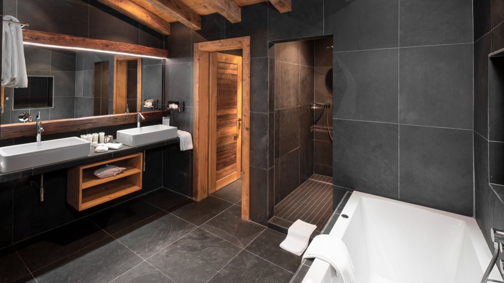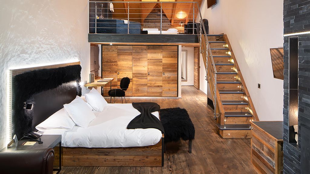2 king size beds – 95sqm / 1022sqft – includes mezzanine floor – large balcony overlooking the alps – extremely spacious suite – en-suite bathroom with jacuzzi and shower – 2 separate toilets – bathrobes and slippers – hairdryer – hotel toiletries – complimentary wi-fi – flat-screen tv – telephone – desk – heating – safe – minibar – nespresso machine and kettle – 1 extra bed possible – charges apply – 5 persons maximum