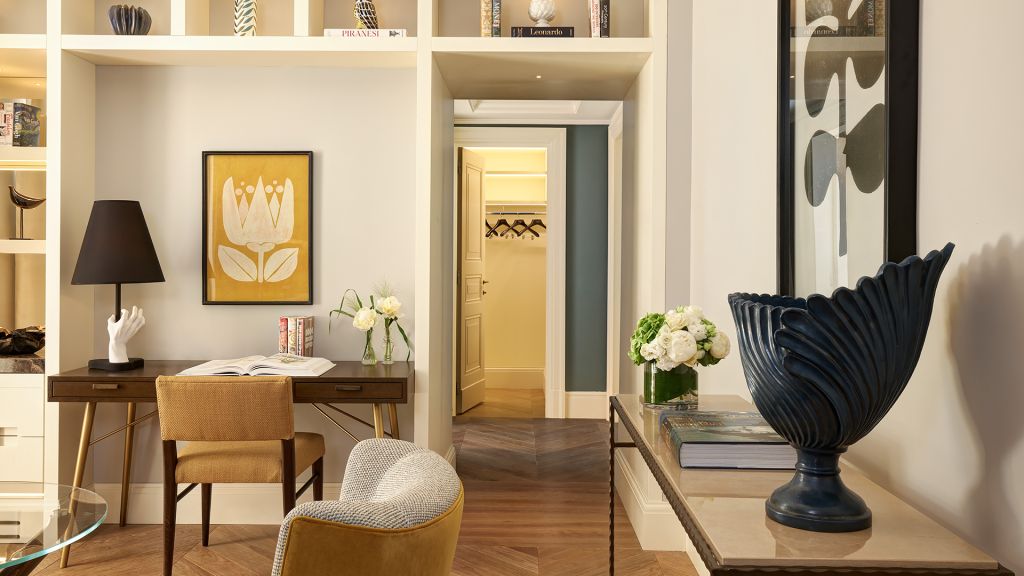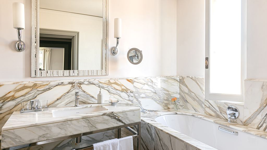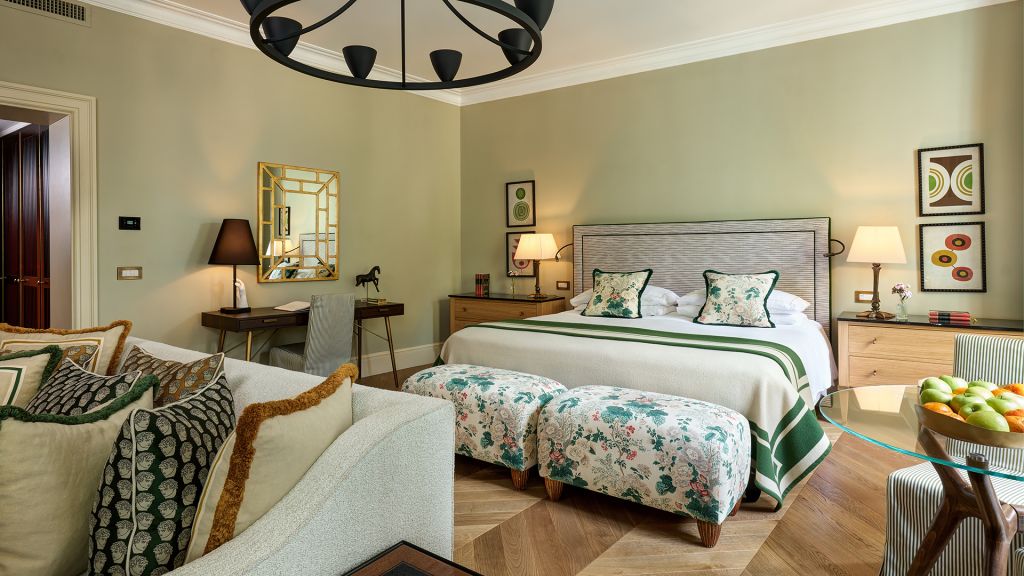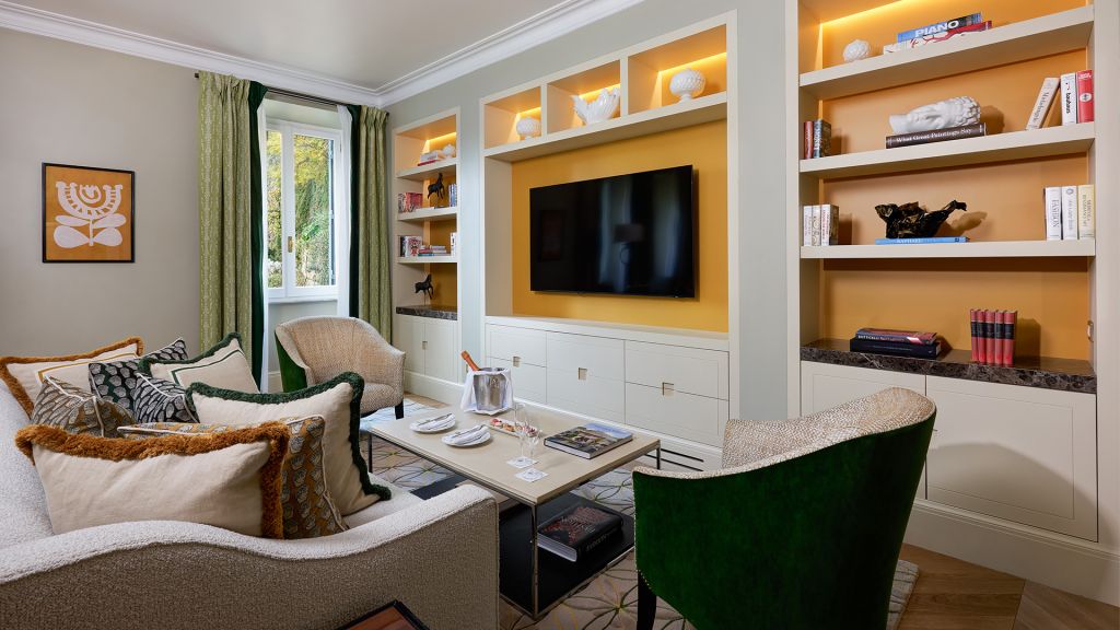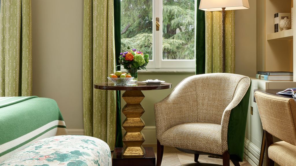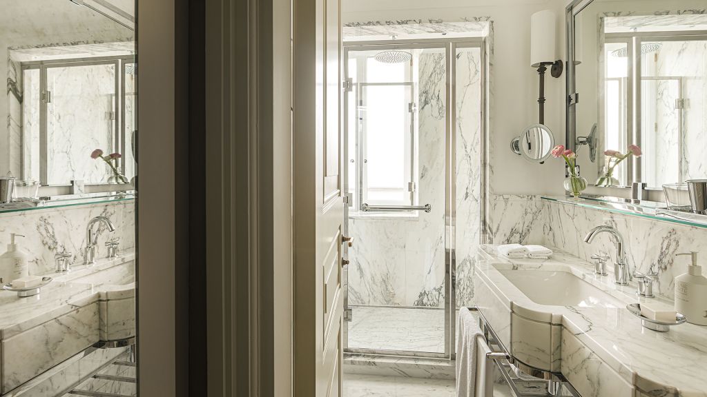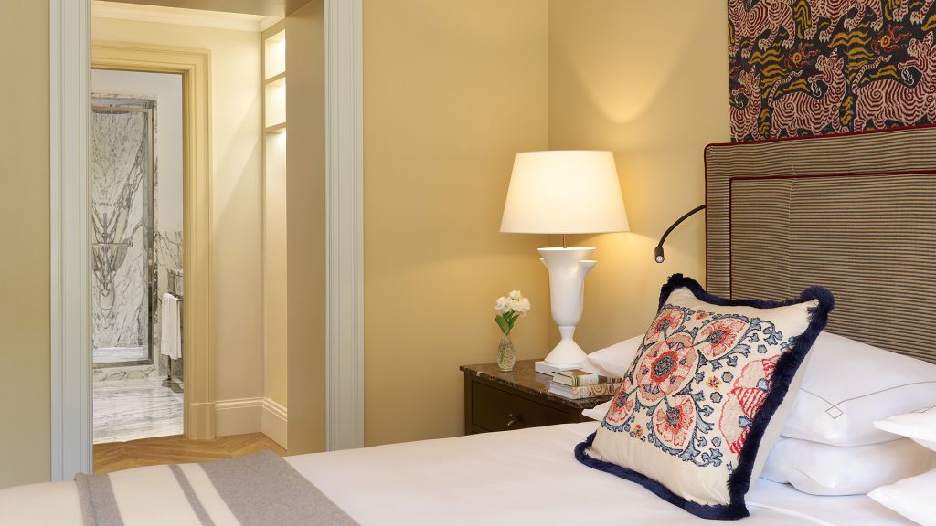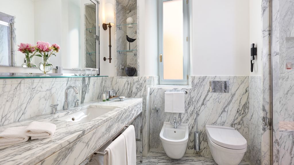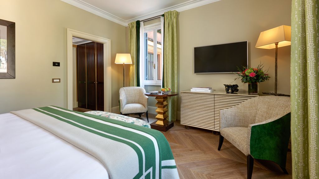 Features floor-to-ceiling windows, French balcony overlooking Pincian Hill and Hotel de Russie’s Secret Garden, spacious sitting room and dining area from the bedroom, which has a walk-in wardrobe with a dressing-table. The opulent marble bathroom has a separate bathtub, double shower and double wash basins and the suite also has its own powder room. Includes Irene Forte Skincare products in the bathroom.