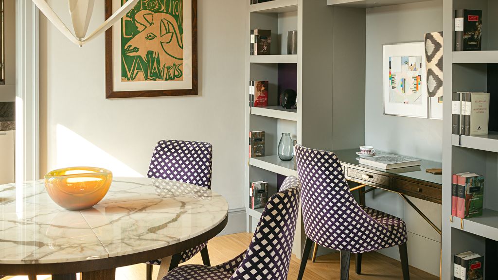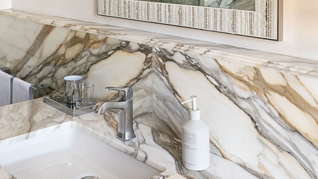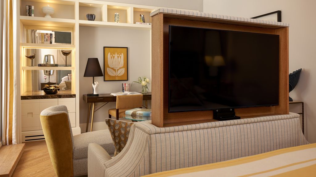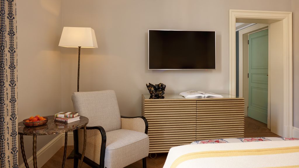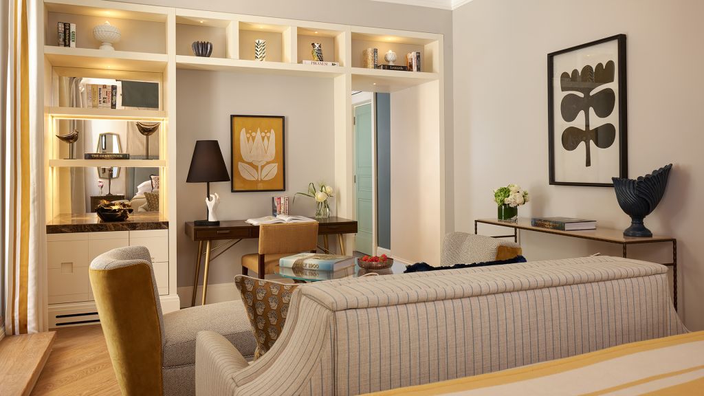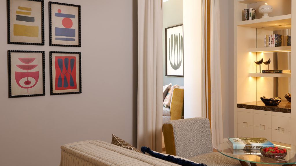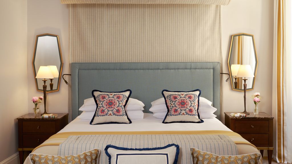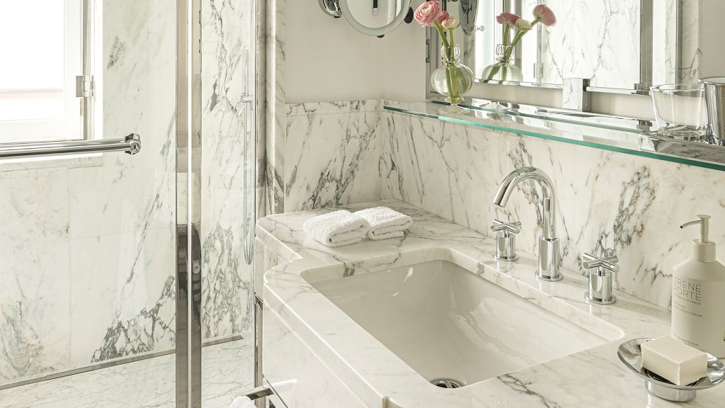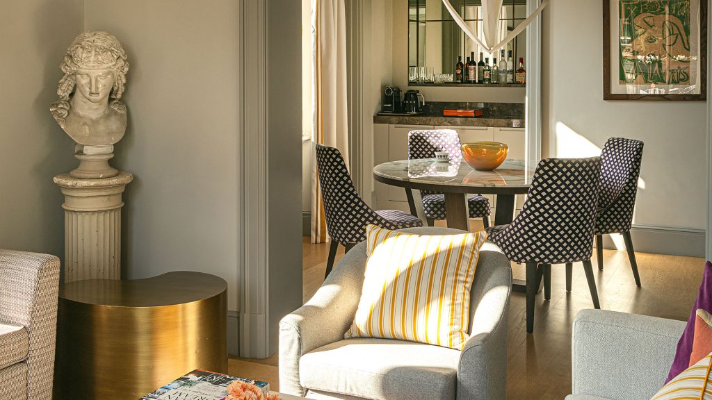 Features floor-to-ceiling windows, French balcony overlooking Pincian Hill and Hotel de Russie’s Secret Garden, spacious sitting room and dining area from the bedroom, which has a walk-in wardrobe with a dressing-table. The opulent marble bathroom has a separate bathtub, double shower and double wash basins and the suite also has its own powder room. Includes Irene Forte Skincare products in the bathroom.