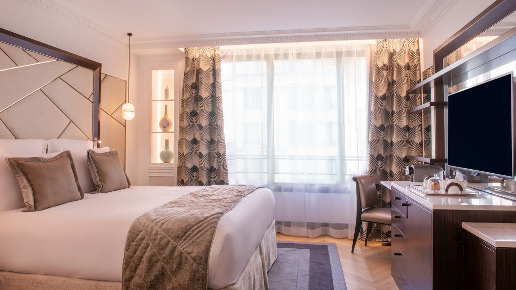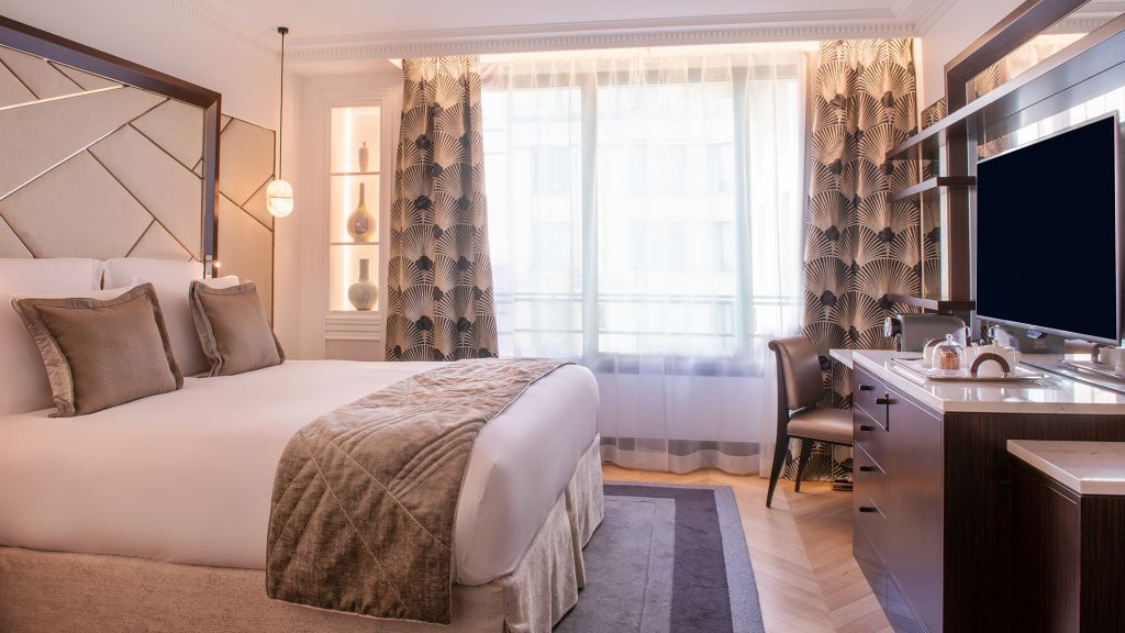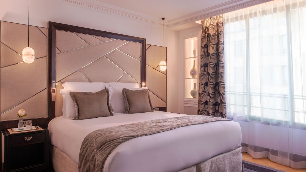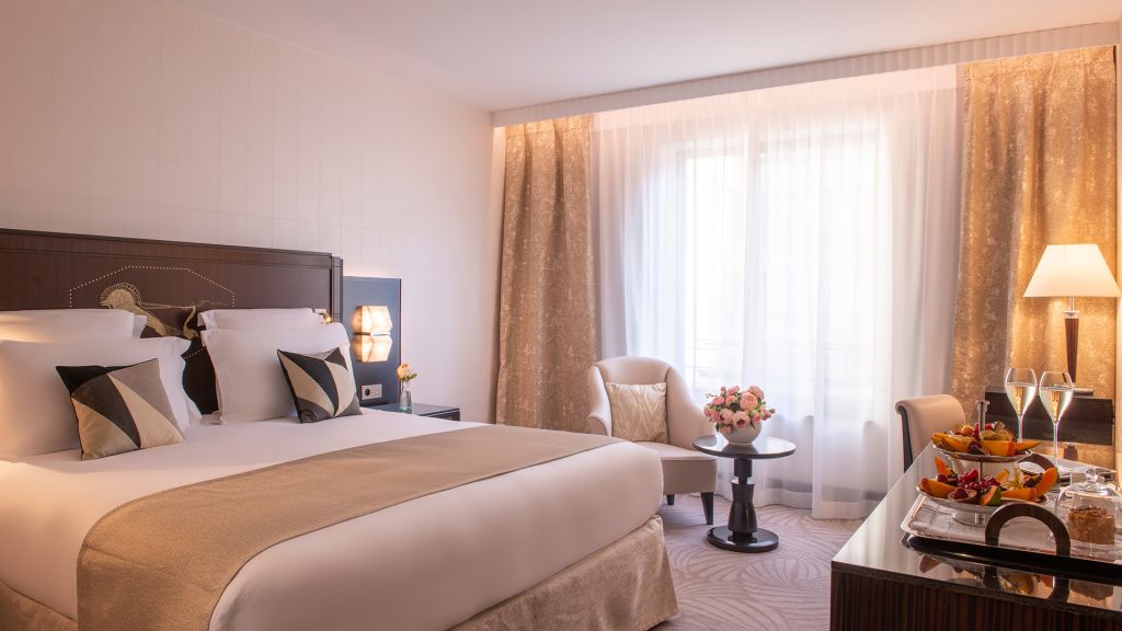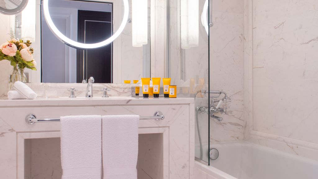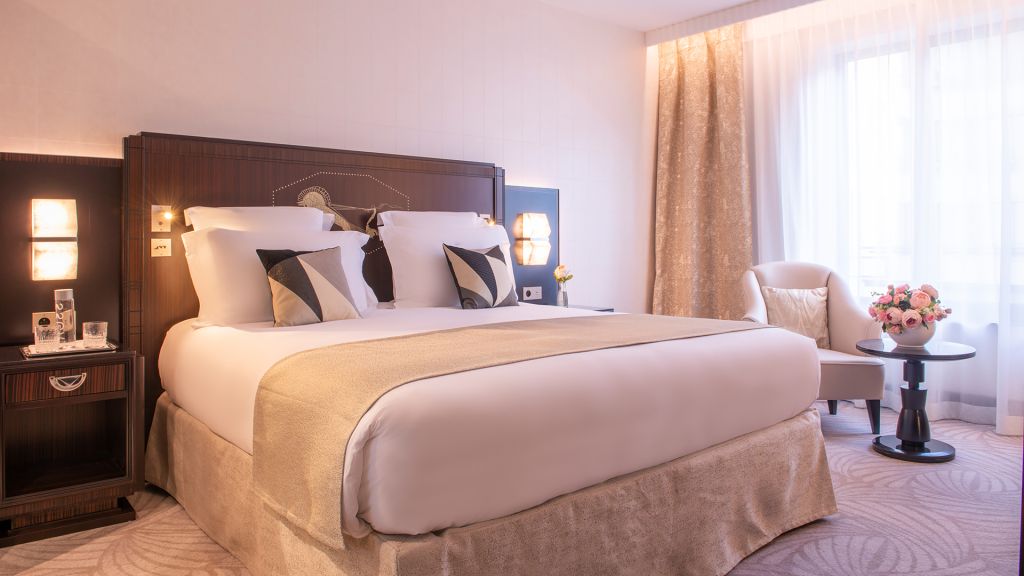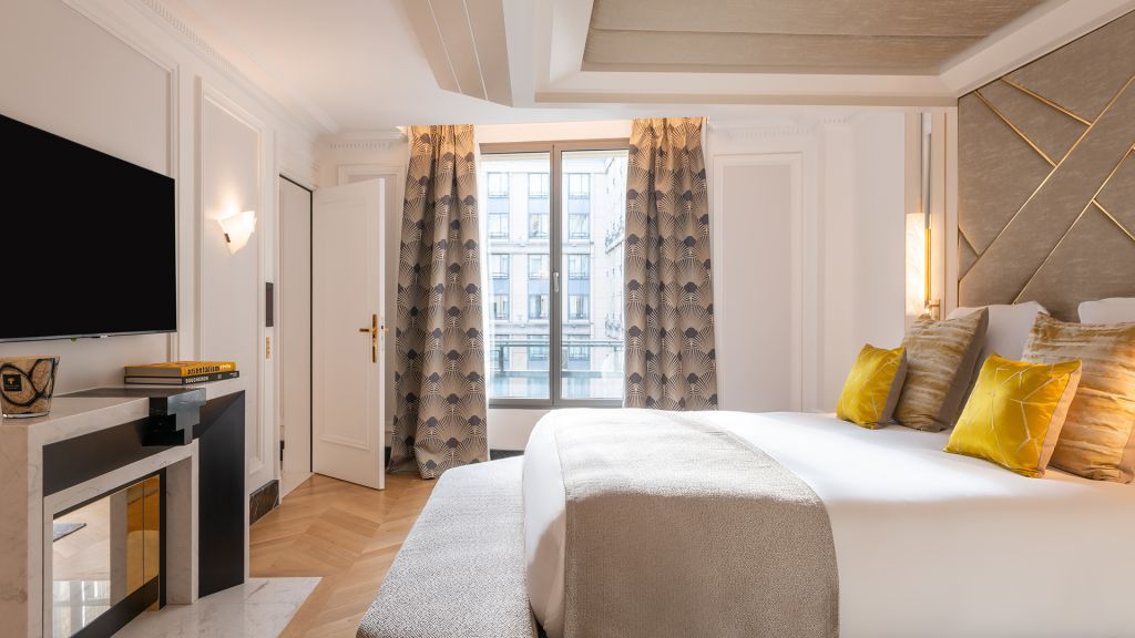 These fully-renovated, 30 sqm prestige balcony rooms offer an extremely elegant and luxurious living space. They have a king-size or twin beds complete with magnificent alabaster headboards, and a large balcony with beautiful views over the rooftops of paris or the eiffel tower. The huge bathrooms in white carrara marble and alabaster are fitted with a bathtub and / or shower. You can also enjoy high-speed internet, a coffee machine.