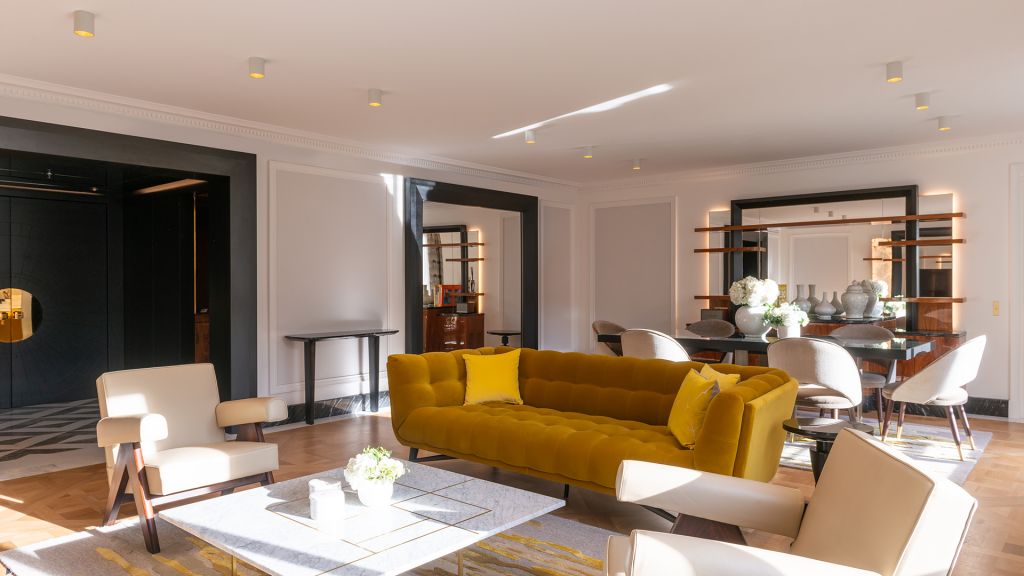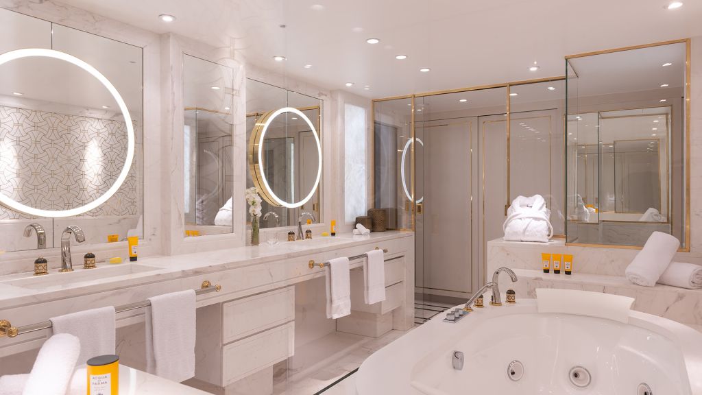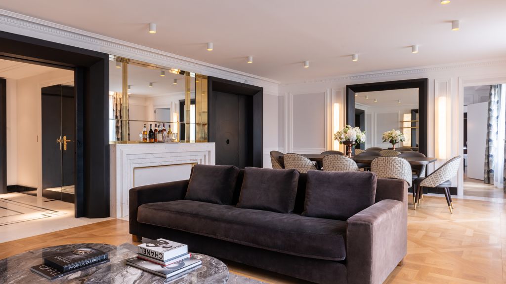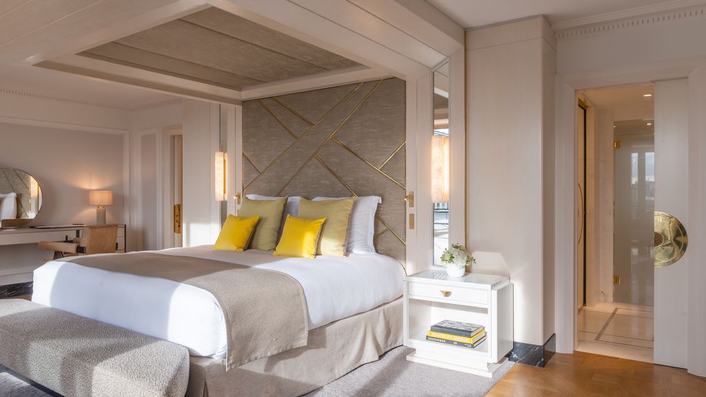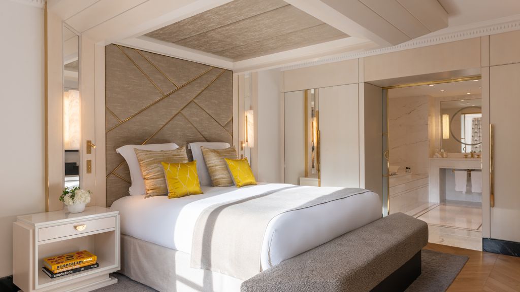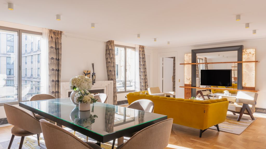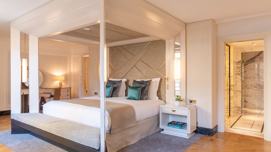 Discover the parisian experience in a unique setting overlooking the hotel's large green garden. The triomphe suite opens onto a large living and dining room, ideal for hosting your private dinners or organizing a cocktail in an exceptional setting. The master bedroom reveals a king-size four-poster bed, decorated with a dedar fabric headboard inlaid with brass and alabaster light fixtures. The main bathroom, entirely dressed in marble, with goldsmith faucets, has a mosaic steam shower inlaid with mother-of-pearl and gold leaf, as well as a jacuzzi for unique moments of relaxation. A guest bedroom completes this idyllic setting, with its own bathroom entirely covered in marble. This 160m² triomphe suite can be transformed into a 270m² private space, perfect for accommodating up to 10 people.