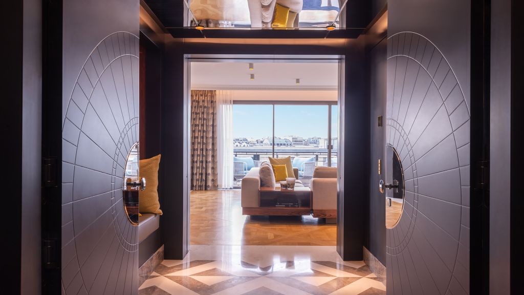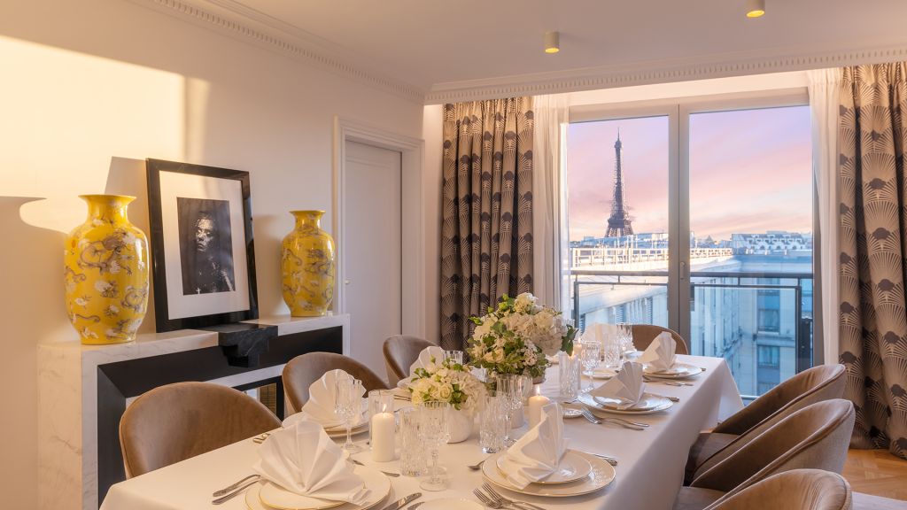 Offering a breathtaking view of the eiffel tower and the roofs of paris, the eiffel suite welcomes you in an exceptional space, right up to your bedroom. With a furnished terrace of 30m², this apartment is decorated in the greatest elegance, with its woodwork and moldings. It includes a large marble entrance, a large bright living room and an independent dining room, both opening onto the terrace offering a breathtaking view of the iron lady. The master bedroom reveals a king size bed, decorated with dedar fabrics inlaid with brass and alabaster. The huge bathroom, entirely dressed in marble, is equipped with a large mosaic steam room inlaid with mother-of-pearl and gold leaf, as well as a jacuzzi for unique moments of relaxation. A guest bedroom completes this idyllic setting, with its marble bathroom. This 160m² eiffel suite can be transformed into a 210m² private space that can accommodate up to 6 people.