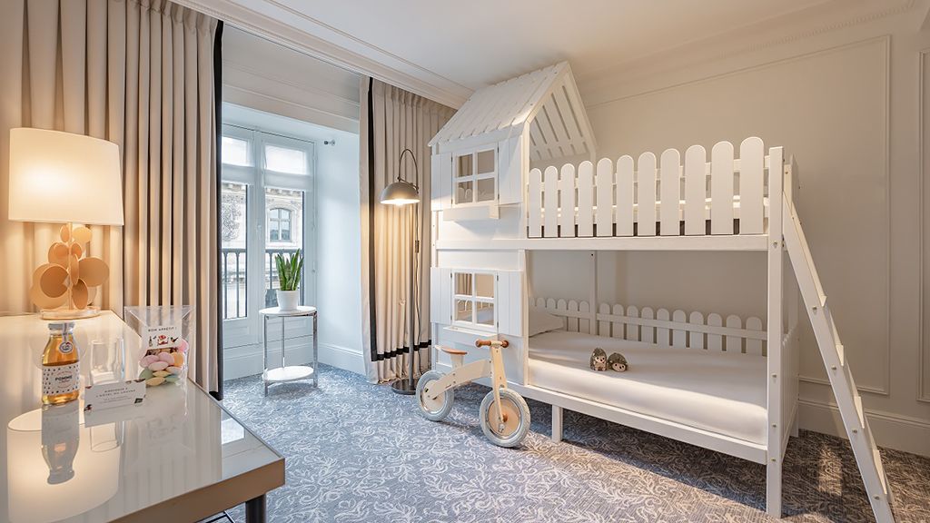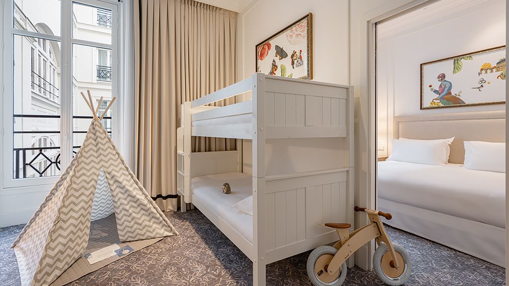 Treat your family to an unforgettable stay in these cozy 40-square-meter (430 sq.ft.) family suites offering views over Paris. They feature a king-bed master bedroom, a marble bathroom, and a separate room with a sensational bunk beds house.