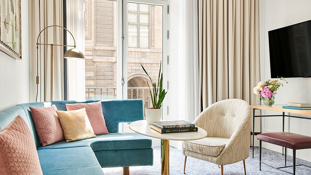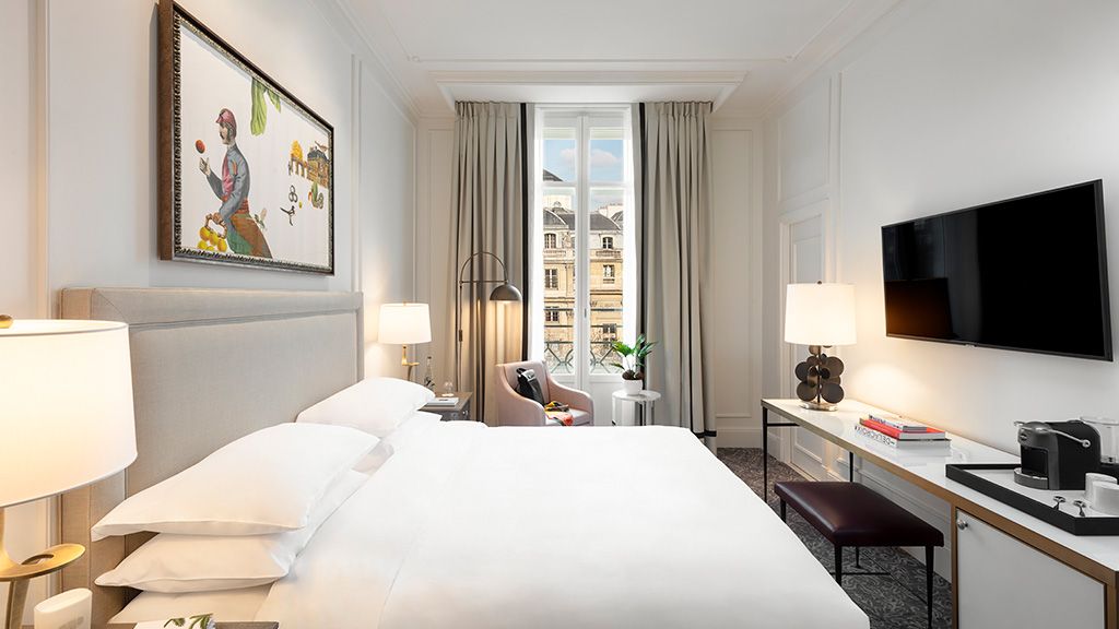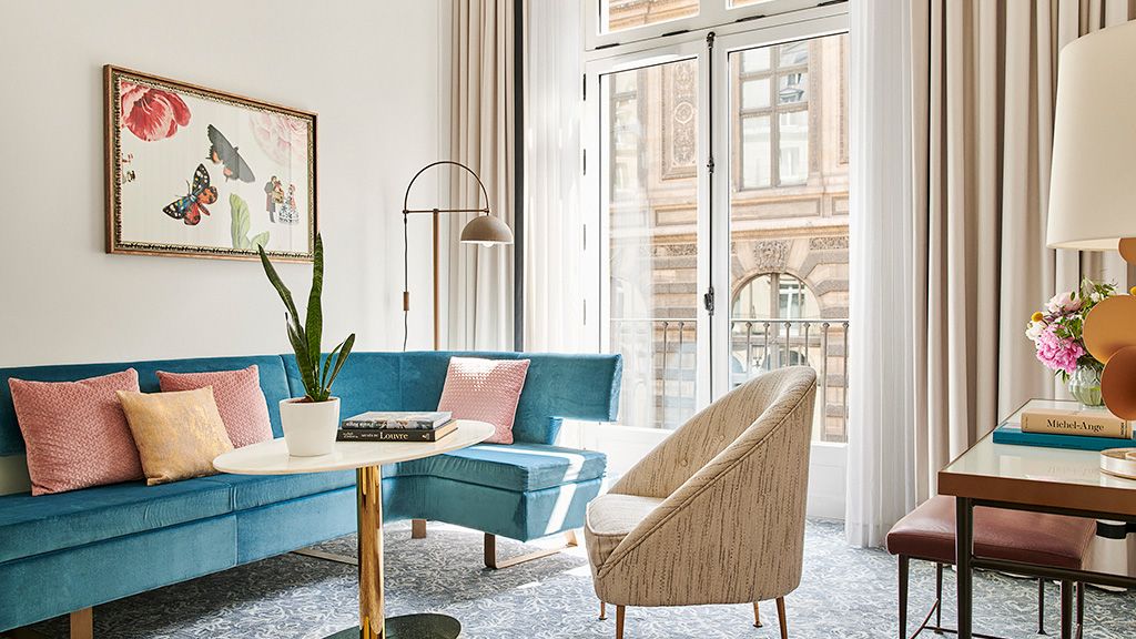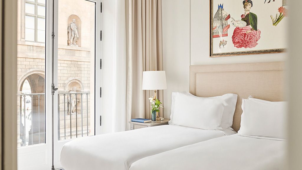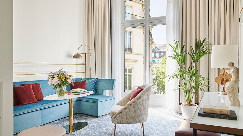 Bathed in natural daylight, these 50-square-meter (540 sq ft) Louvre suites are decorated with typical Parisian flair. They offer a king-bed room and a separate living room, and overlook the Louvre Museum and the Palais-Royal.