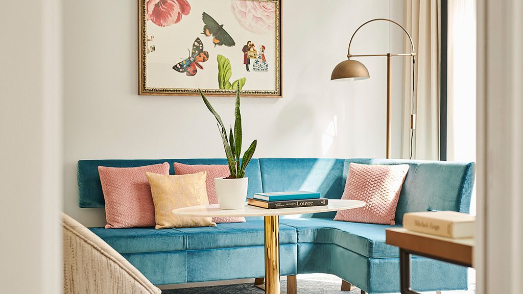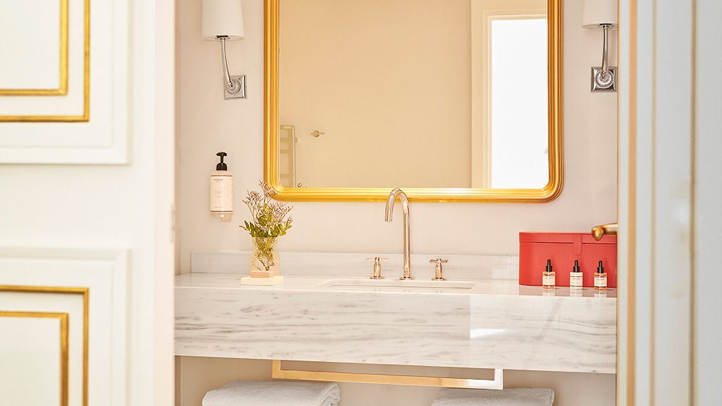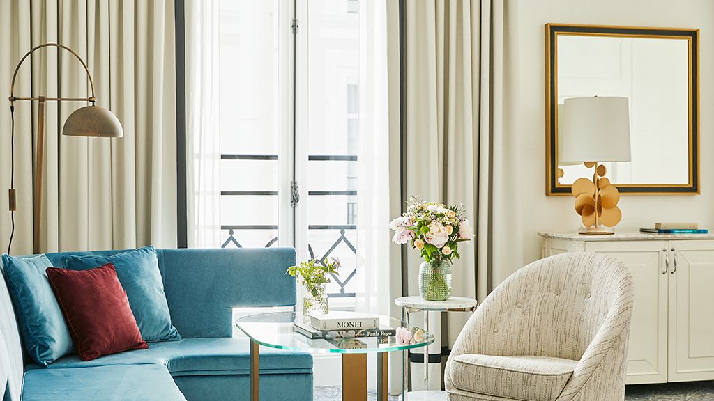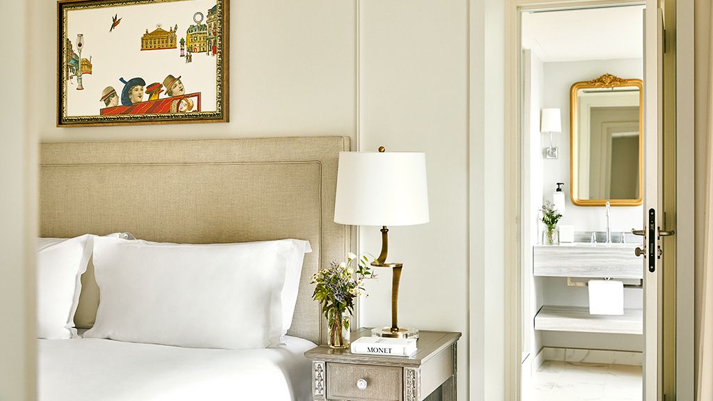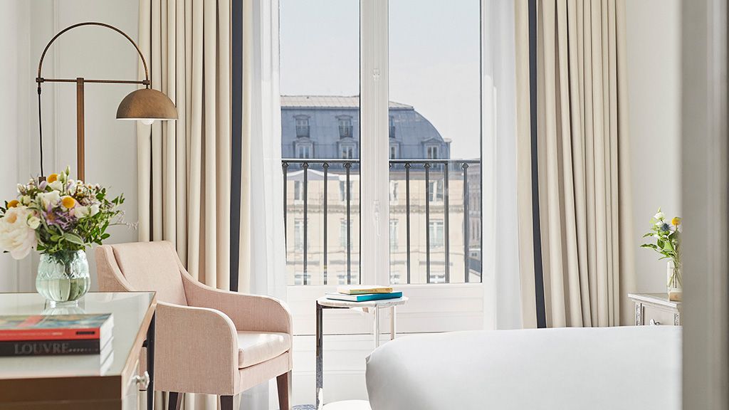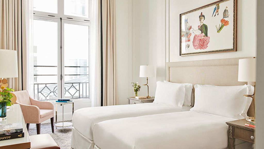 Bathed in natural daylight, these 50-square-meter (540 sq ft) Louvre suites are decorated with typical Parisian flair. They offer a king-bed room and a separate living room, and overlook the Louvre Museum and the Palais-Royal.
